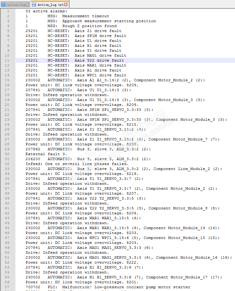 一台新机床在自动换刀过程中XY轴冲过程序预设的行程导致主轴直接撞在了刀库链上,电源上级熔断器断开一相。损失很大,今天查看机床运行日志感觉是电源缺相引起的事故,在程序运行过程中所有驱动器使能全部中断,再加上机床的换刀动作行进速度很快,导致所有轴在惯性作用下继续移动最终撞击。同时主轴以3000转的初速度刮蹭刀库罩盖持续几秒才完全停下。