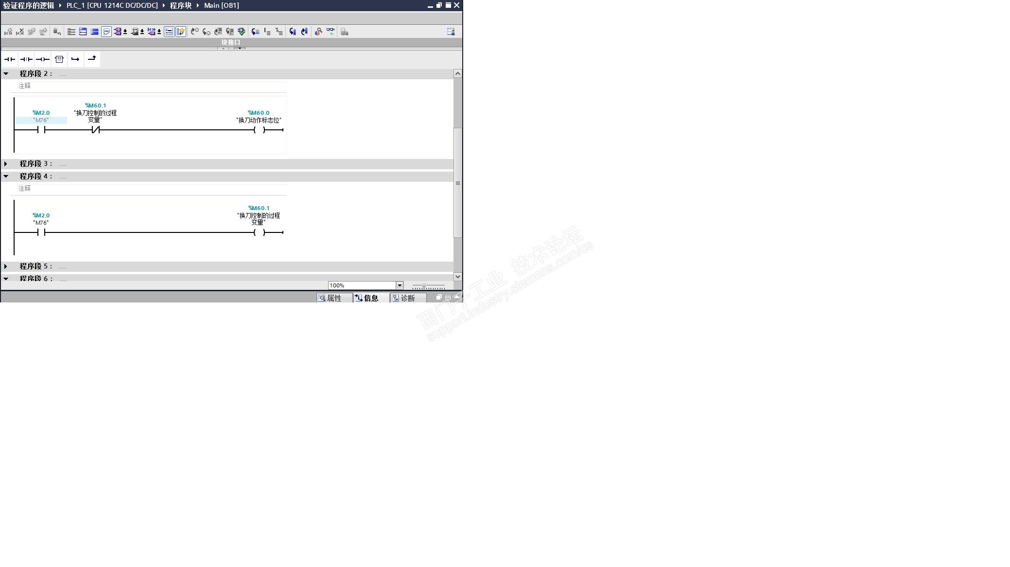 M60.1的线圈经过50mS的延时,目的是让M60.1的线圈延缓几个扫描周期后,再得电,从而确保M60.0有一定的周期内接通的过程,使换刀程序得到了确保。增加接通延时定时器后,因为设备没有在作业,实际应用结果待后续说明。
