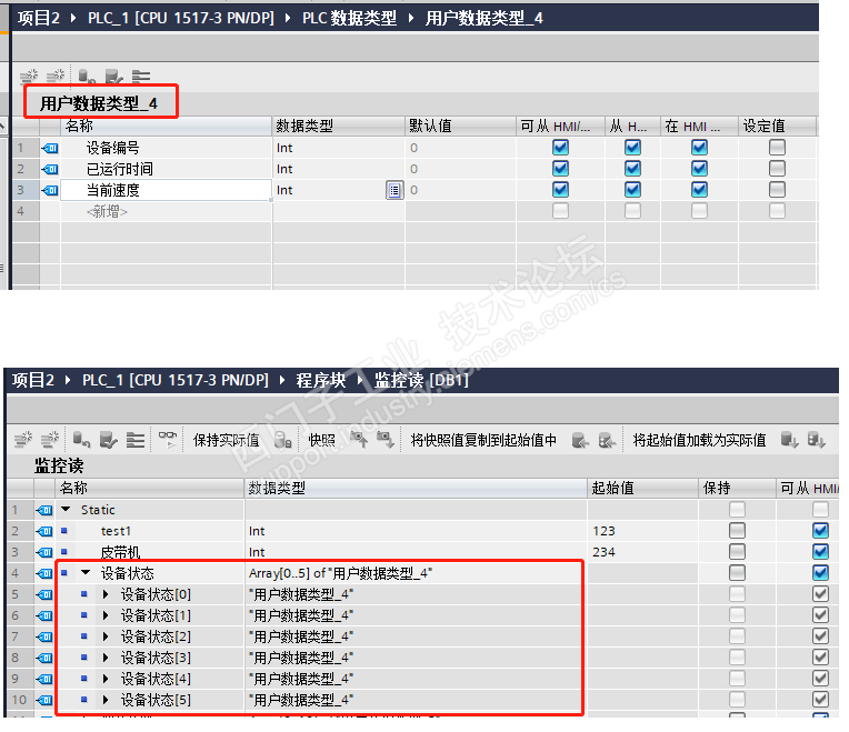 如下图,先定义了一个数据类型:用户数据类型_4。定义了一个数组:设备状态。