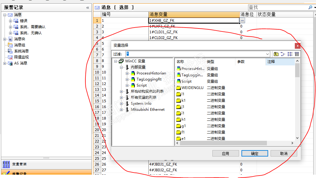 您好,您看看这个图片,课程中说WinCC的消息变量会写入变量管理,这里的消息变量不是我在变量管理所选择的吗