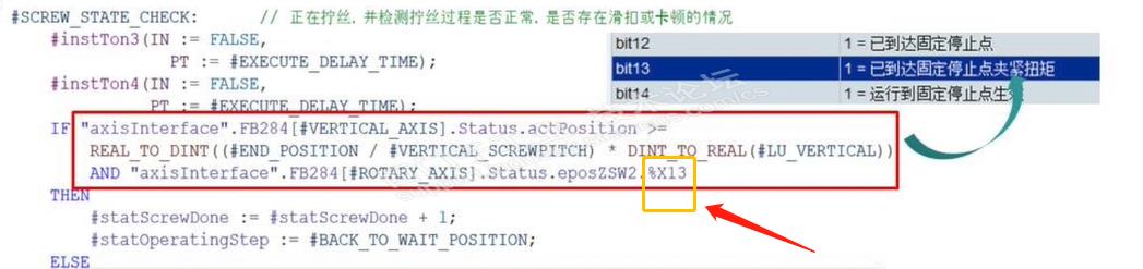 问1:Bit13置1只是表达已经达到了设定的扭矩,当Bit12置1才表示到达了固定停止点。但是课程中为什么是通过Bit13来表示已经到达固定停止点?