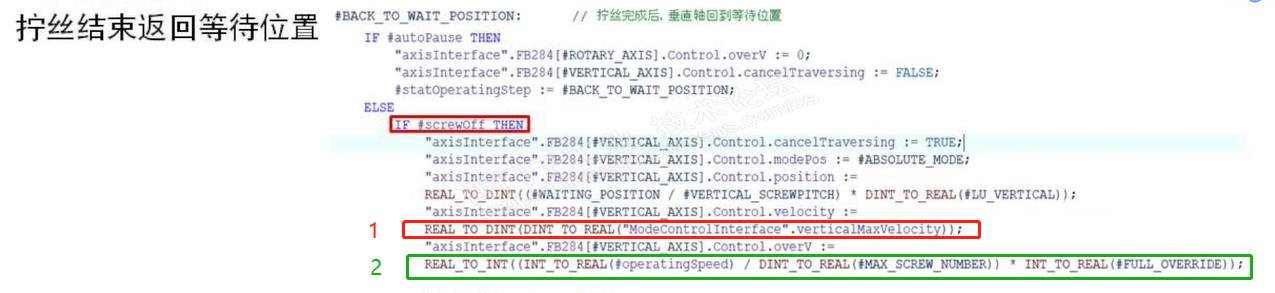 因为“operatingSpeed”的数值是人为定义的,我可以定义20,30,40,50,而#MAX_SCREW_NUMBER 和 #FULL_OVERRIDE 的值是一定的,所以当operatingSpeed给定的值不一样的话overV管角的值也不一样,所以垂直电机的运行速度就不一样。但是拧丝电机运行程序段2里面反向相对定位的速度是固定的。他们的速度如何成比例关于运行啊?(也就是再松丝的程序中并没有根据垂直电机的速度为拧丝电机设定速度)