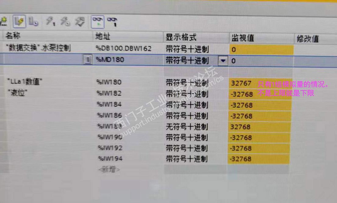 其他情况有值的情况。其他套的柜子里有同时接3~6组环境监测数据的线缆,但是IW通道里的值明显偏高。电流值在4~5mA,在线监测的十进制值应该对应在6000~7000左右吧?显示全部都是20000+,明显不对,但是至少有值...