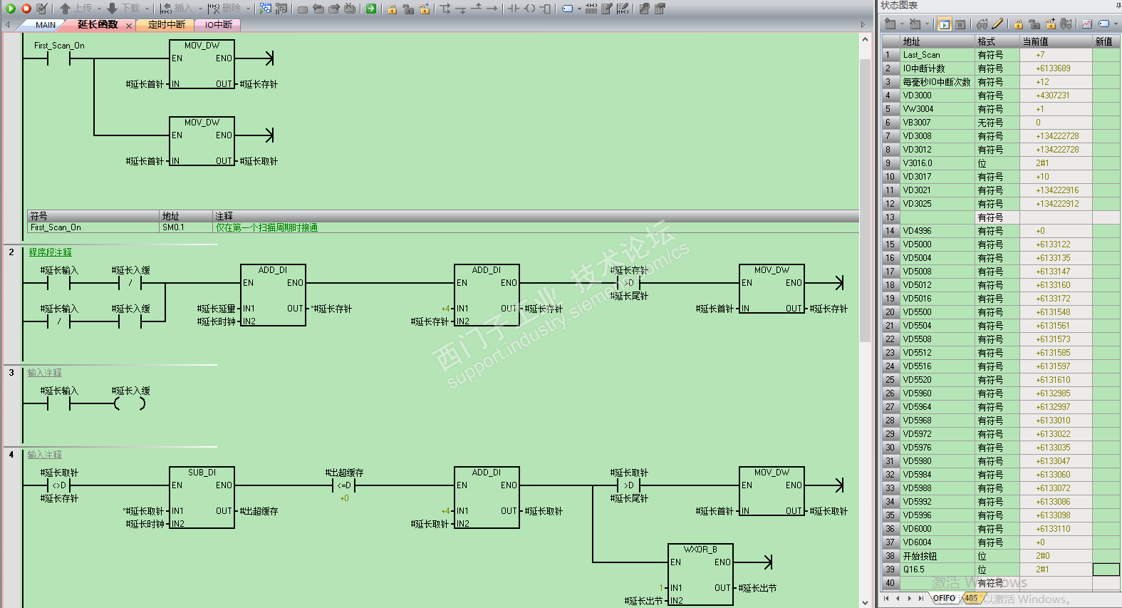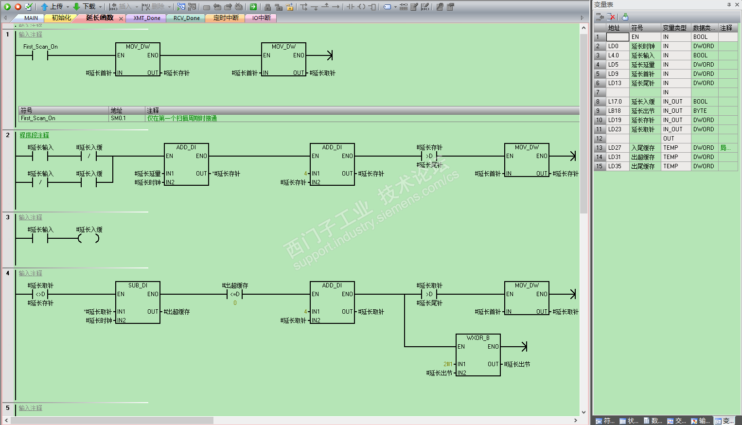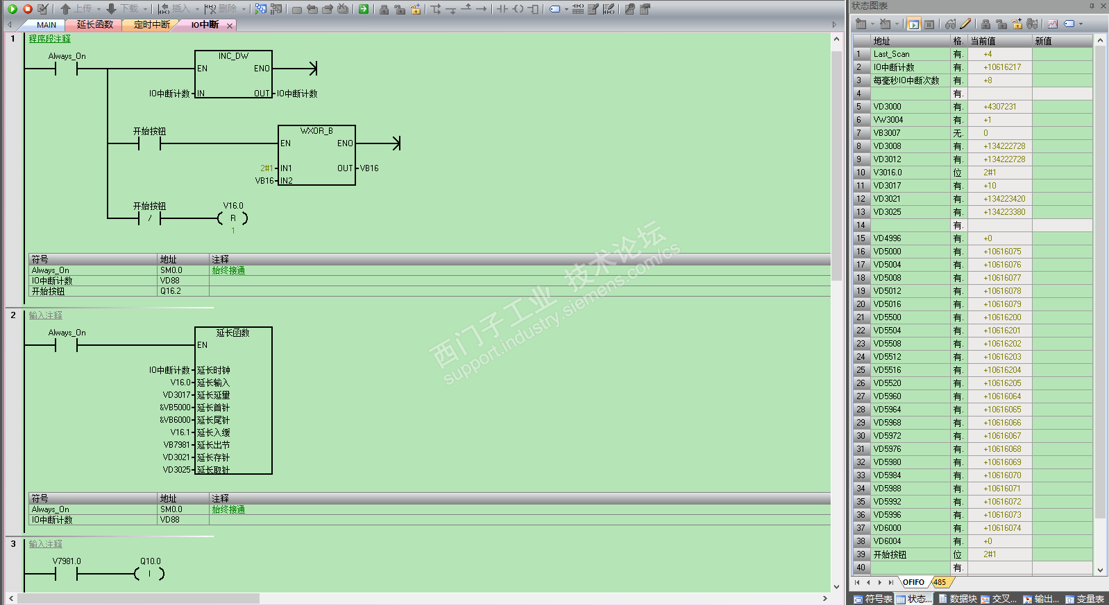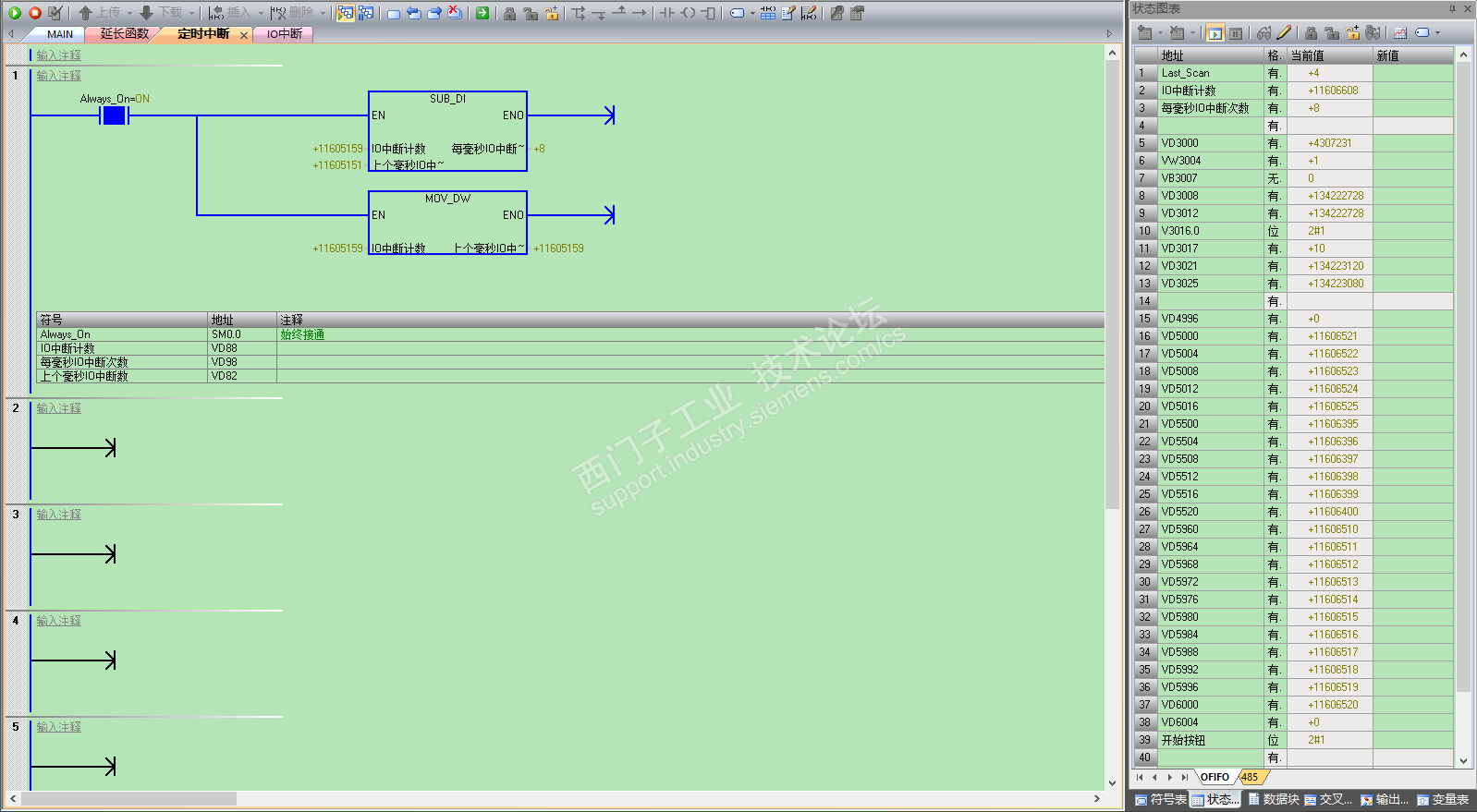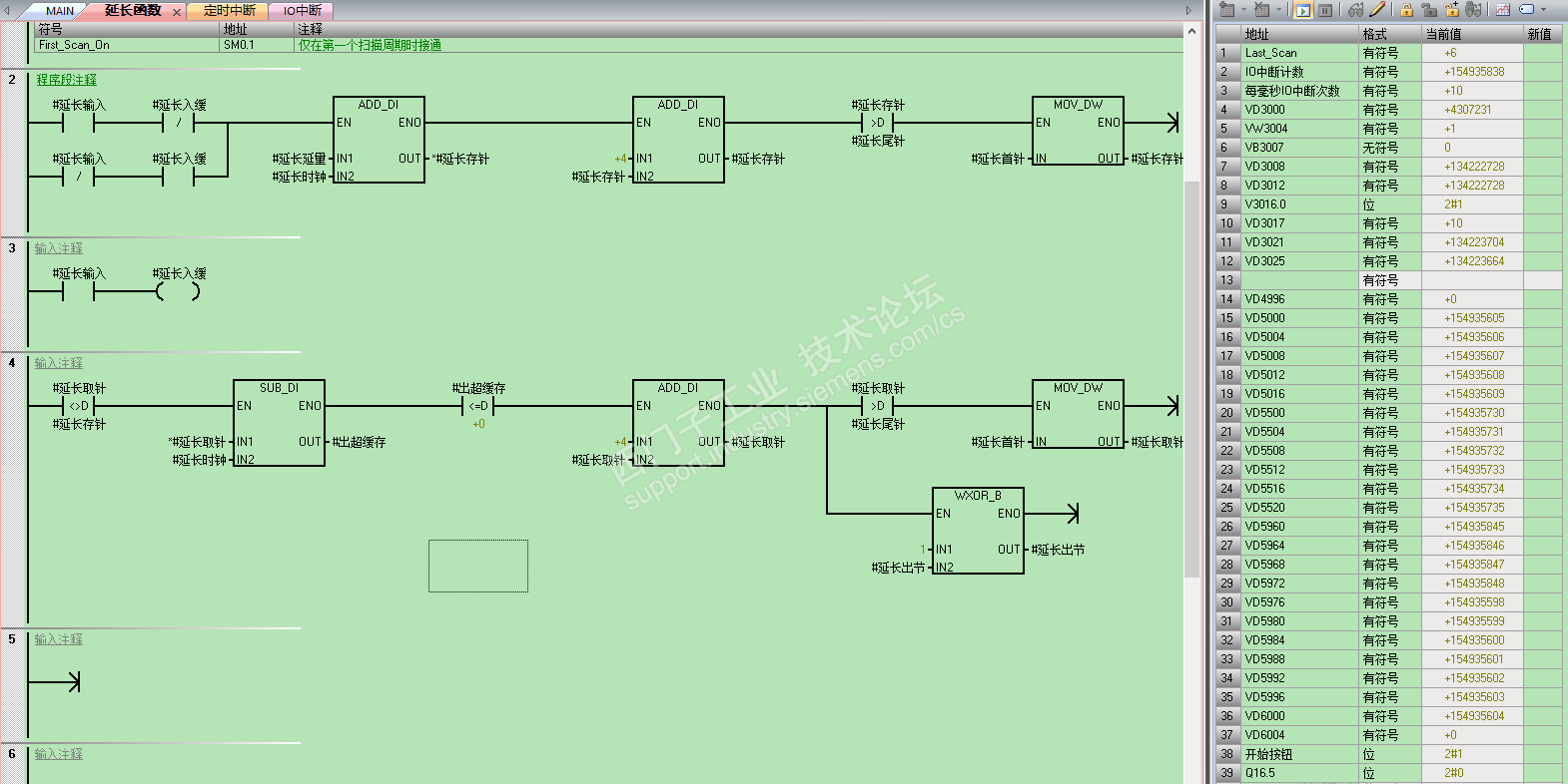 3.9 :将IO中断中的延长子程序全部改成全局变量编程可减少参数传递和局部变量运算,可改善总体时序,减小抖动,由于Smart的任何中断只能立刻中断OB1主程序但不能中断正在执行的低级中断,所以减少定时中断,串口中断等其它中断中的执行语句和时间可以减少最高等级I0.0中断的抖动。由此单一的较少内容的对时序要求稍高的代码段用全局变量编程有优势。以上所有说明S7-200Smart的底层软件架构很强大。