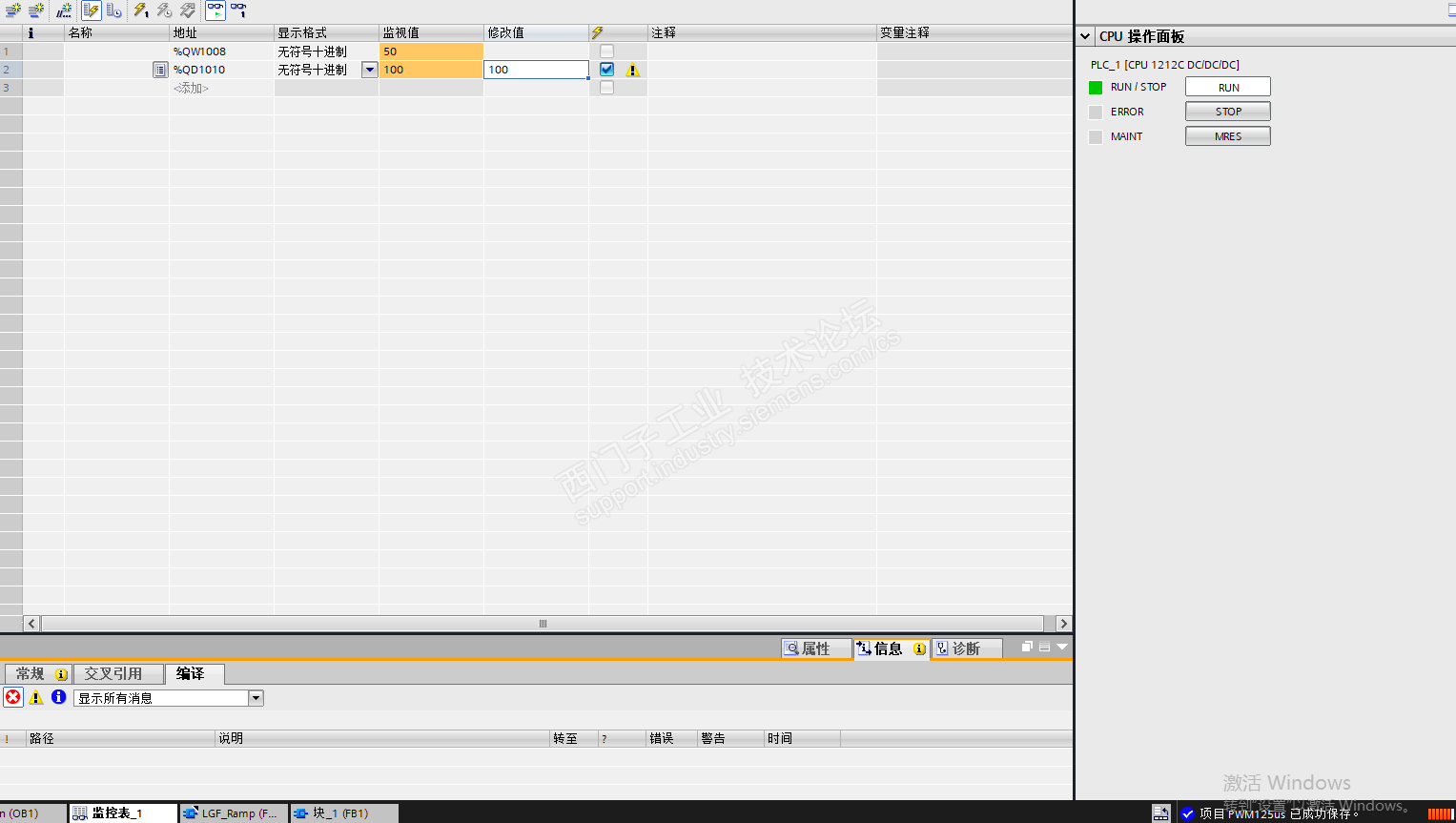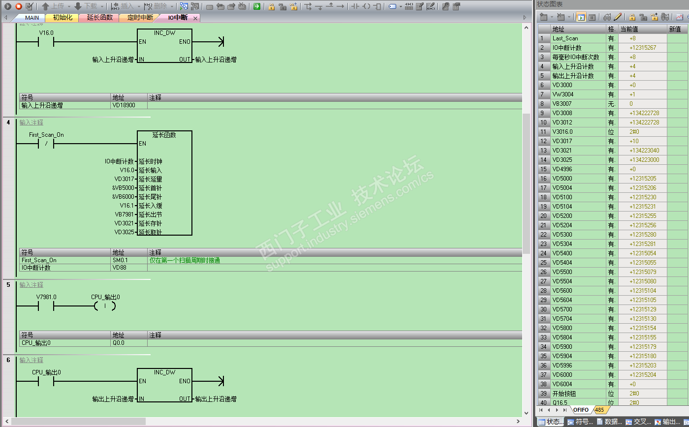 (3):3.1:S7-200SmartCR60的I0.0中断中接收1200的脉冲串,在IO中断中调用延长函数。延长函数的缓存队头地址是&VB5000;队尾地址是&VB6000;从状态表看出地址中每个值都间隔1个时钟数==125us.每毫秒的定时中断中统计出每一毫秒内I0.0中断了8次即125us.由此延长函数的分辨率达到125us。