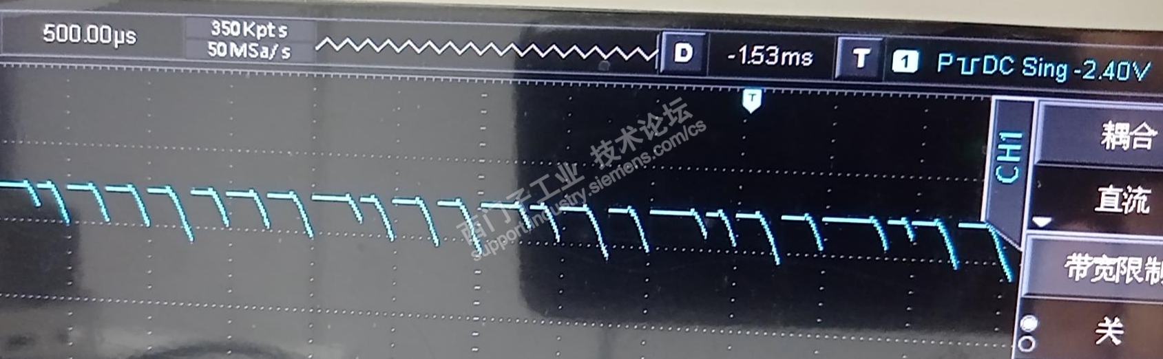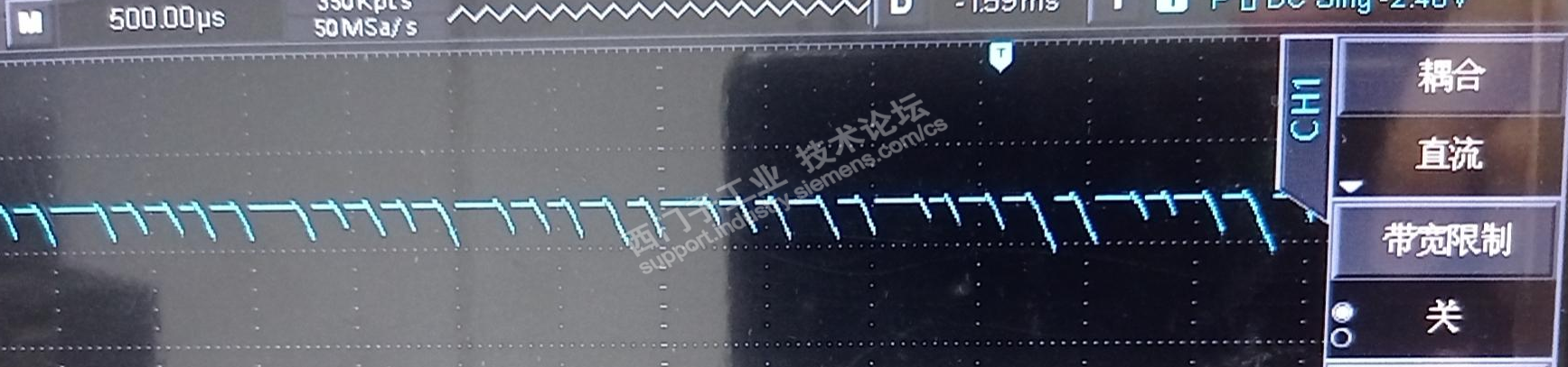 3.6:以下图片是125us时序下,示波器是Q0.0的输出波形,输出Q0.0和输入V16.0计数完全相同的状态表图片和示波器图片(1000us里有4个上升沿),示波器显示Q0.0的下降沿由于没有负载因此无法消耗能量有拖尾,这个可类比485没合适终端电阻的话通讯信号质量可能会有问题。测试平台另一台ST60。