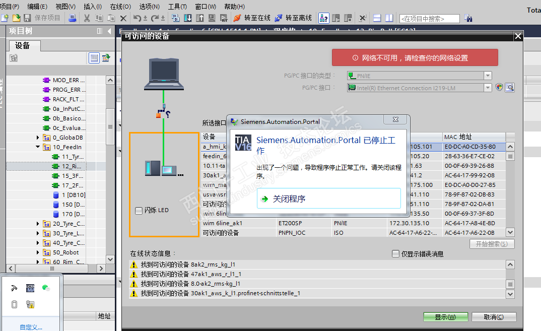 最近新上的设备都使用的是 V16 版本的软件,也将电脑安装了一个 V16 版本的软件 ,原来还有一个 V14 的版本,现在使用过程中遇到一个很是头疼的问题就是,点击连接在线时会报警,软件关闭是什么情况?