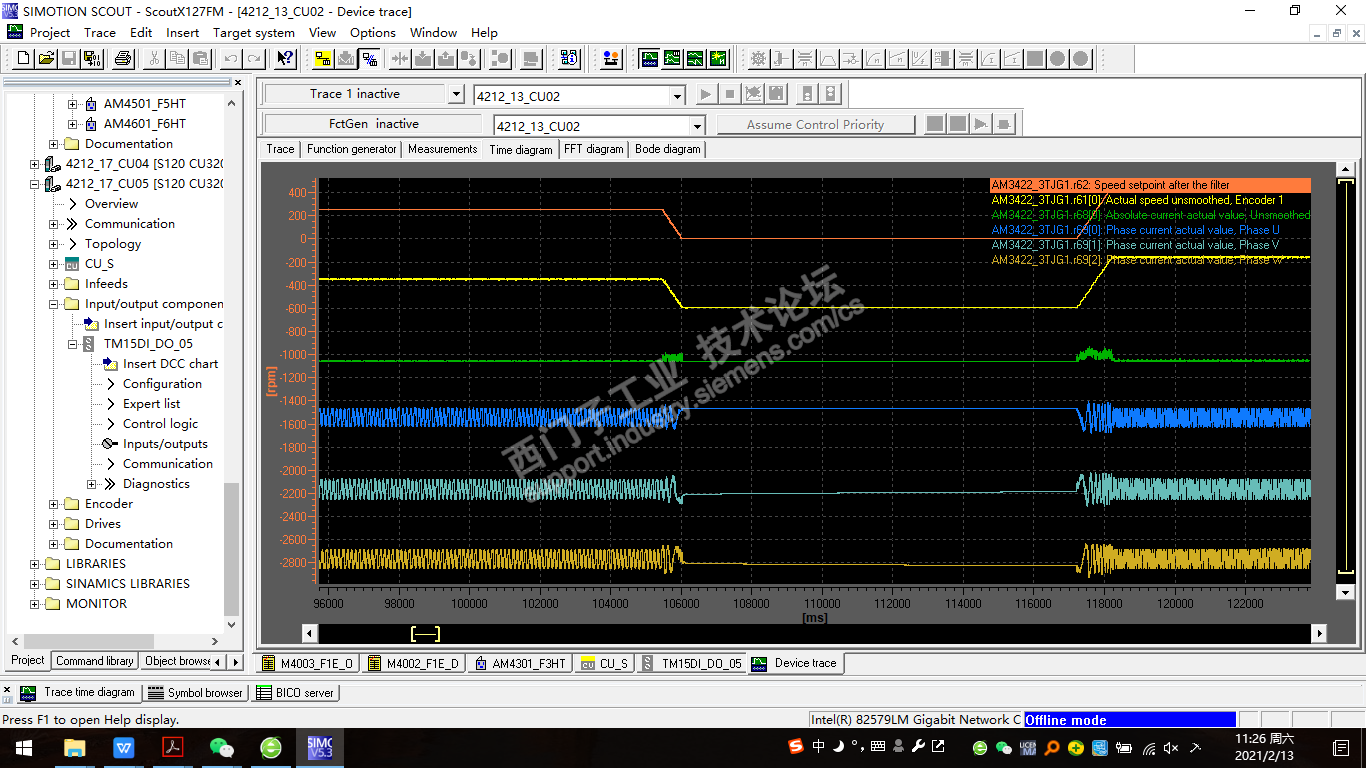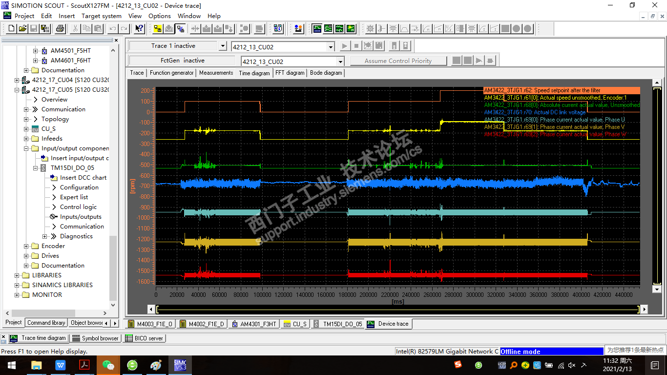 可以看到编码器速度反馈、输出电流、三相电流实际值异常有波动(观察r69三相电流实际值畸变,波动较大),更换CIM板(IPD是新的)后,现象依旧;