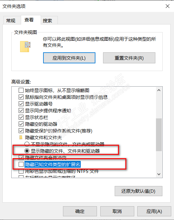 首先您先确认文件夹中文件是否可以显示扩展名以及系统文件是否能显示,具体设置参考下图