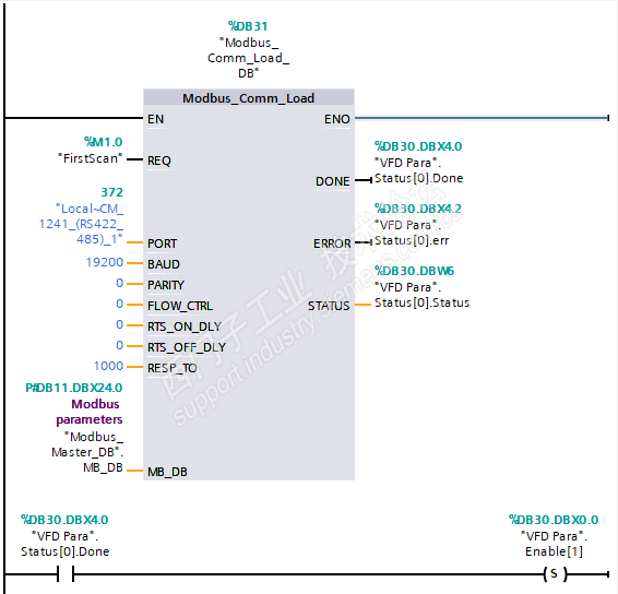 1.使用”Modbus_Comm“组态指令,这个指令的作用是保证程序和硬件组态一致。这个是必须要有的,不管是做主站还是做从站。在指令里面设置好对应的引脚参数。