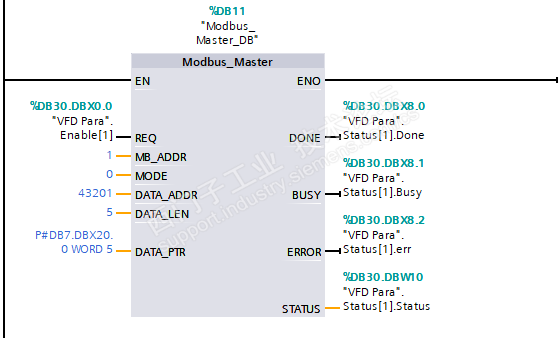 举个例子就是,先建立一个“Modbus_Master”指令,然后程序会自动建立一个DB程序块,这里建立的是DB11,这个DB11就是这个“Modbus_Master”指令的专用背景数据块。接着就在DB11里面找到MB_DB的选项,填入”Modbus_Comm“指令的MB_DB引脚处。
