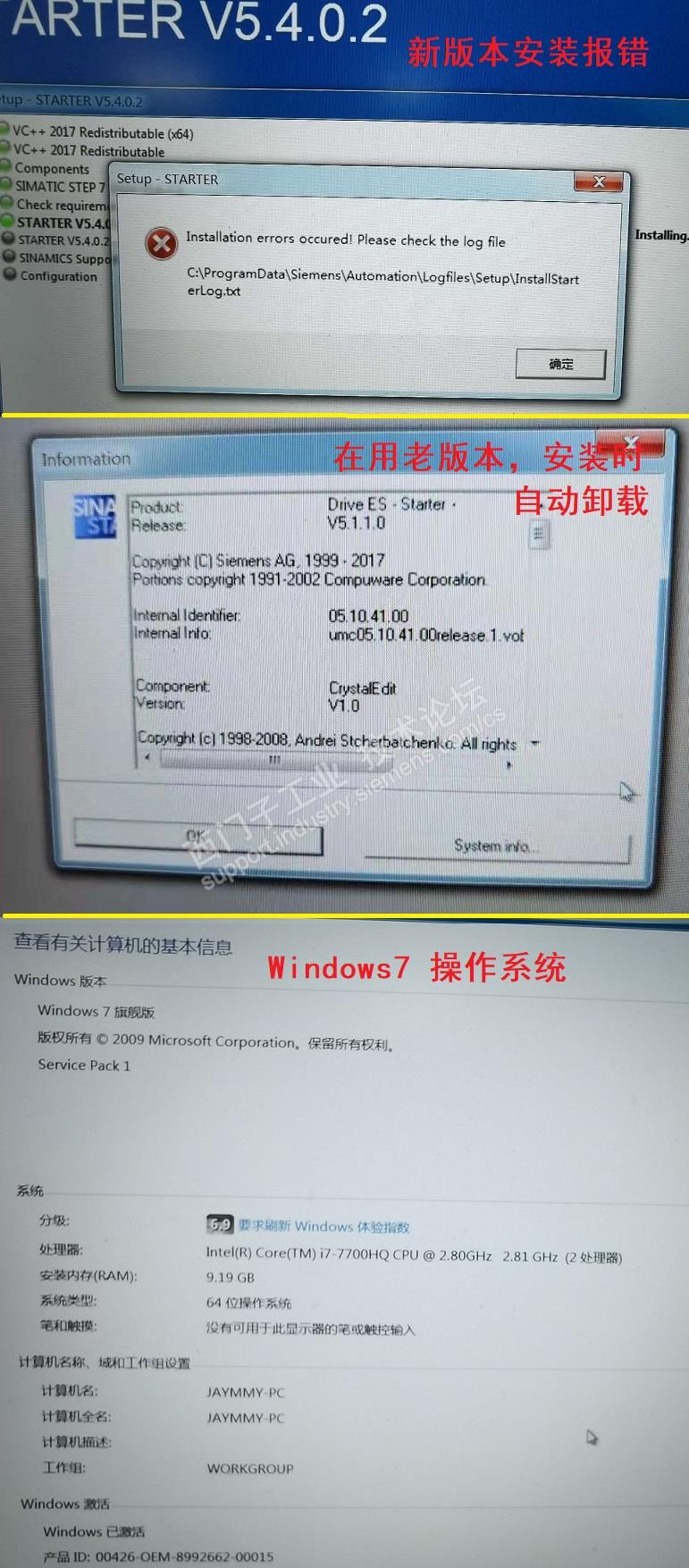 Windows系统照片,老版本Starter照片,新版本Starter 安装报警照片,见附件照片。