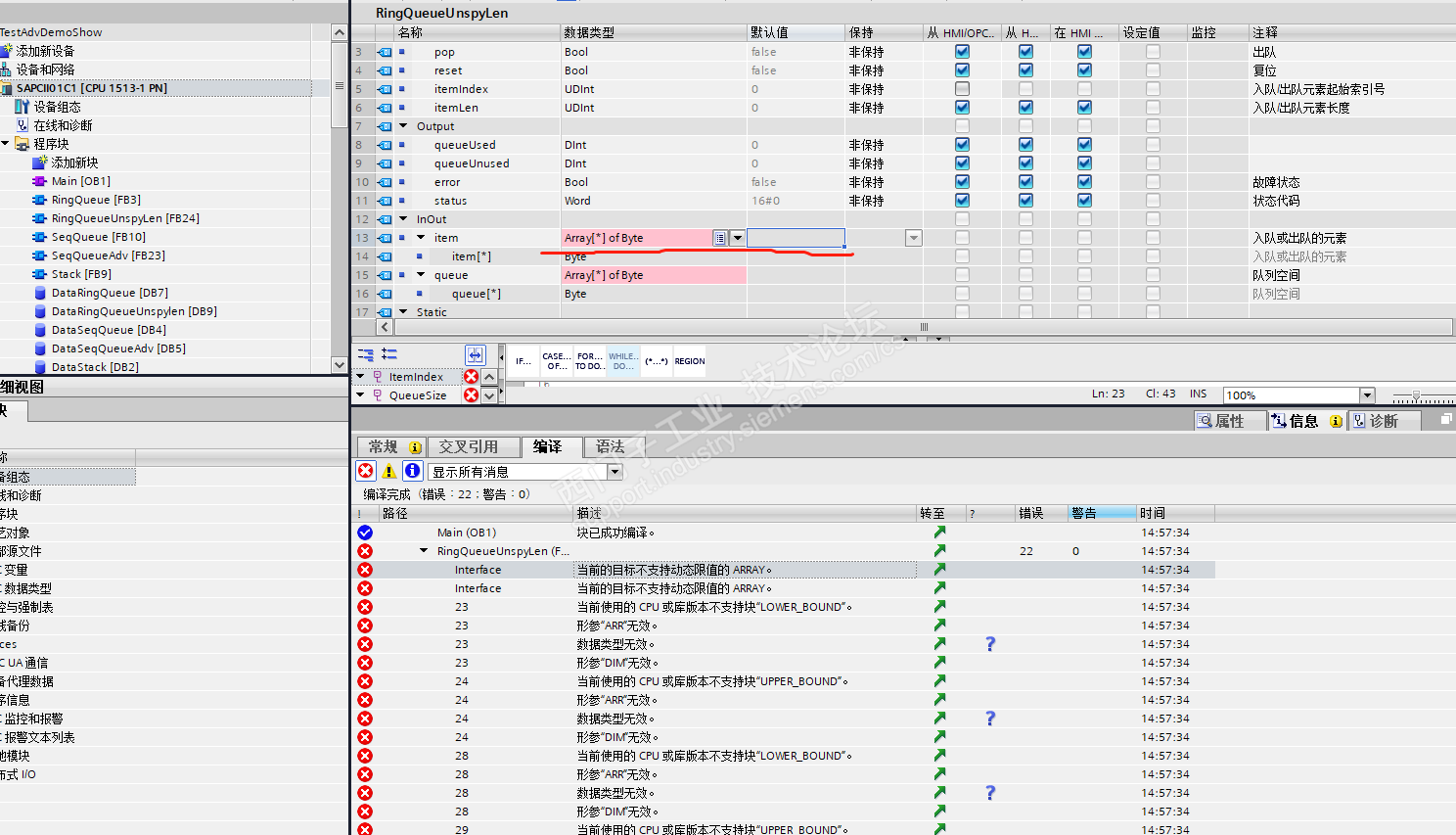 第三部分第一张循环队列的程序故障 编译报警如附件照片,为什么说背景数据库不支持动态array数组