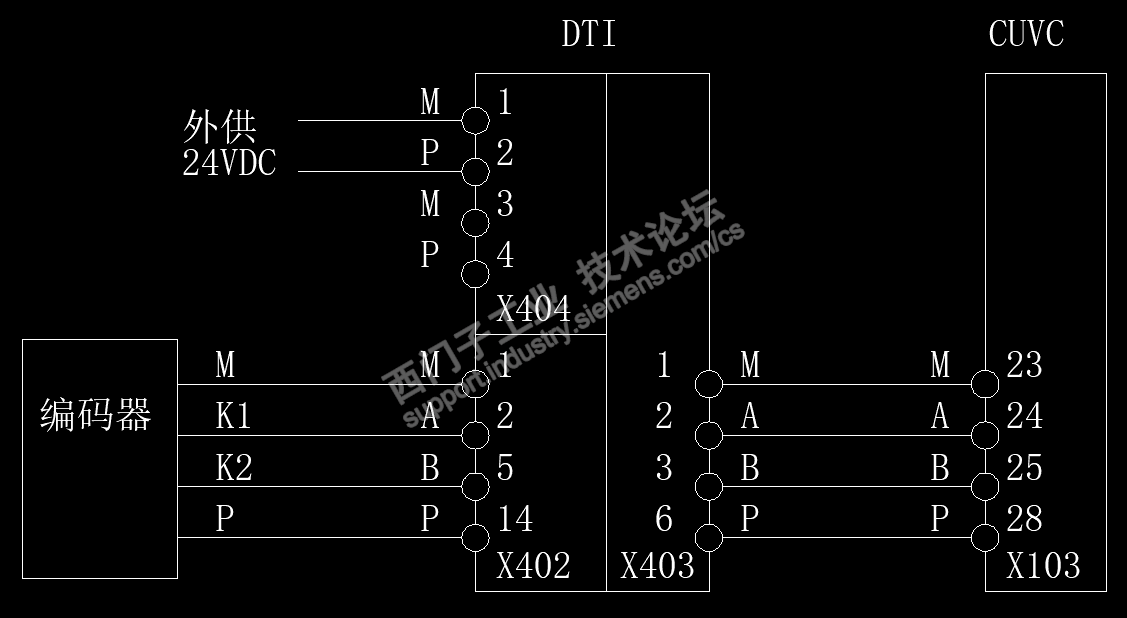 原系统采用VC控制方式,速度实际值来自HUBNAR编码器,通过DTI板转接。原理图给出经典的6SE70编码器的接线方式,如下: