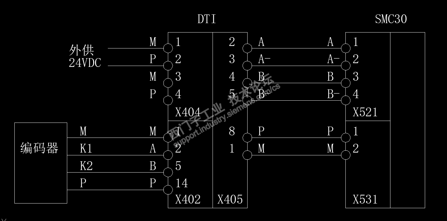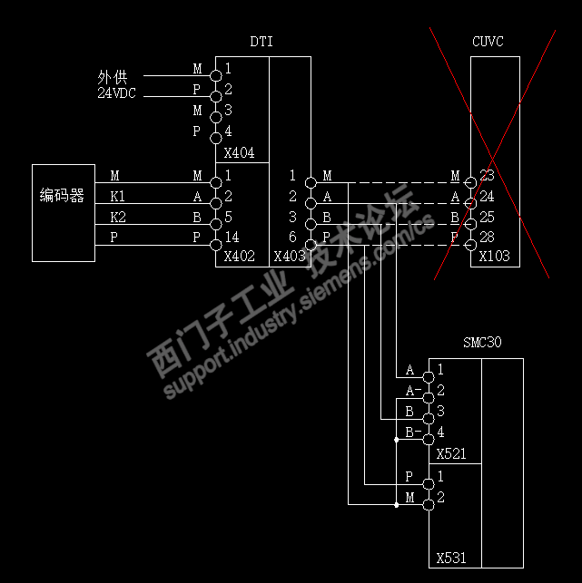 这套系统已运行十多年,因而,对这个接线没有存在任何异议,直接在新的系统中把DTI板中X402端子上的线接到了SINAMICS的SMC30上,如下图所示: