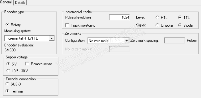 因为DTI的差分输出只能是X405端子的5V的TTL信号,因而,就按上图所示,做了5V差分信号的联接,并且在STARTER中对SMC30重新组态成5V的双极性TTL信号,如下图所示: