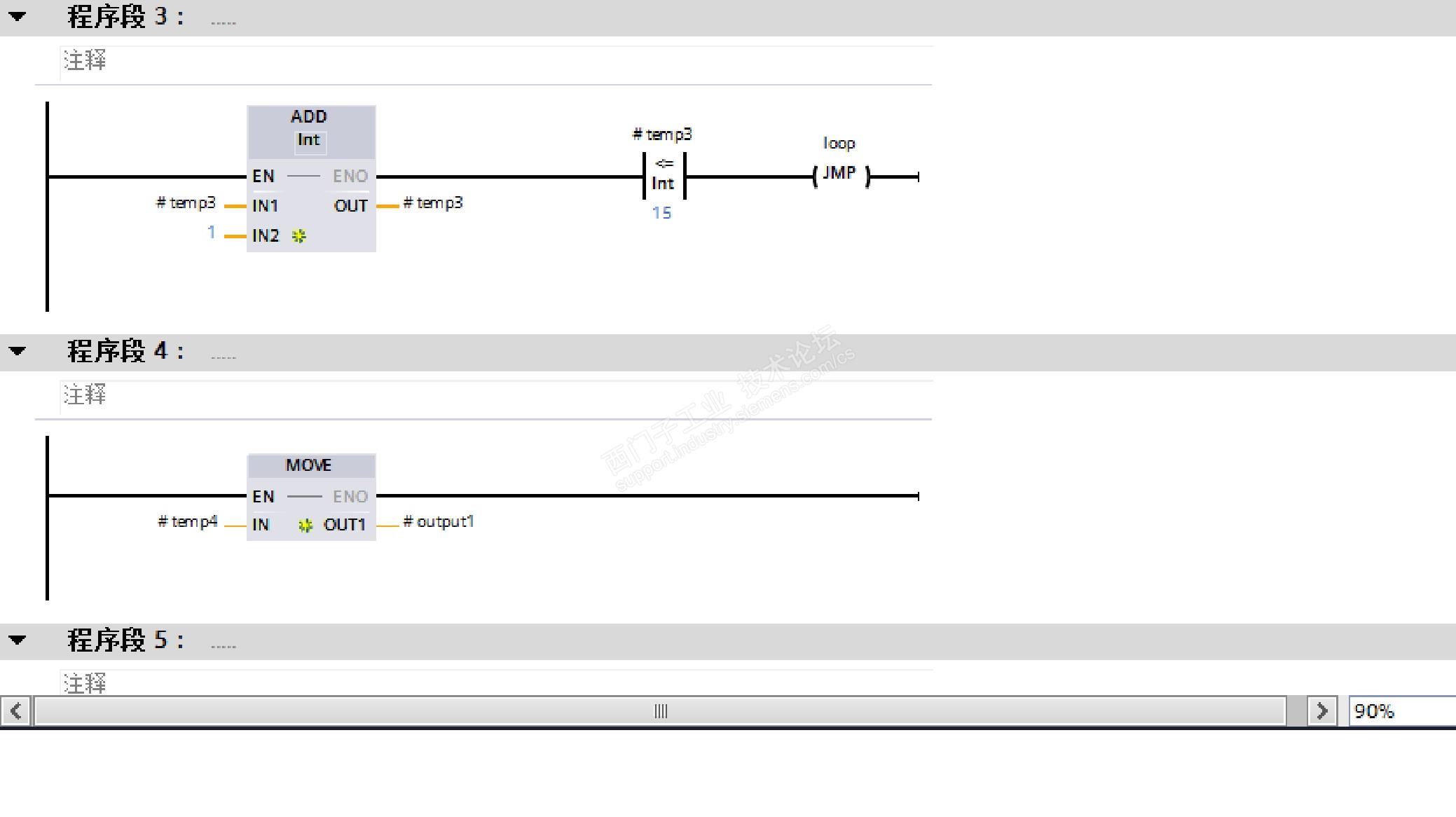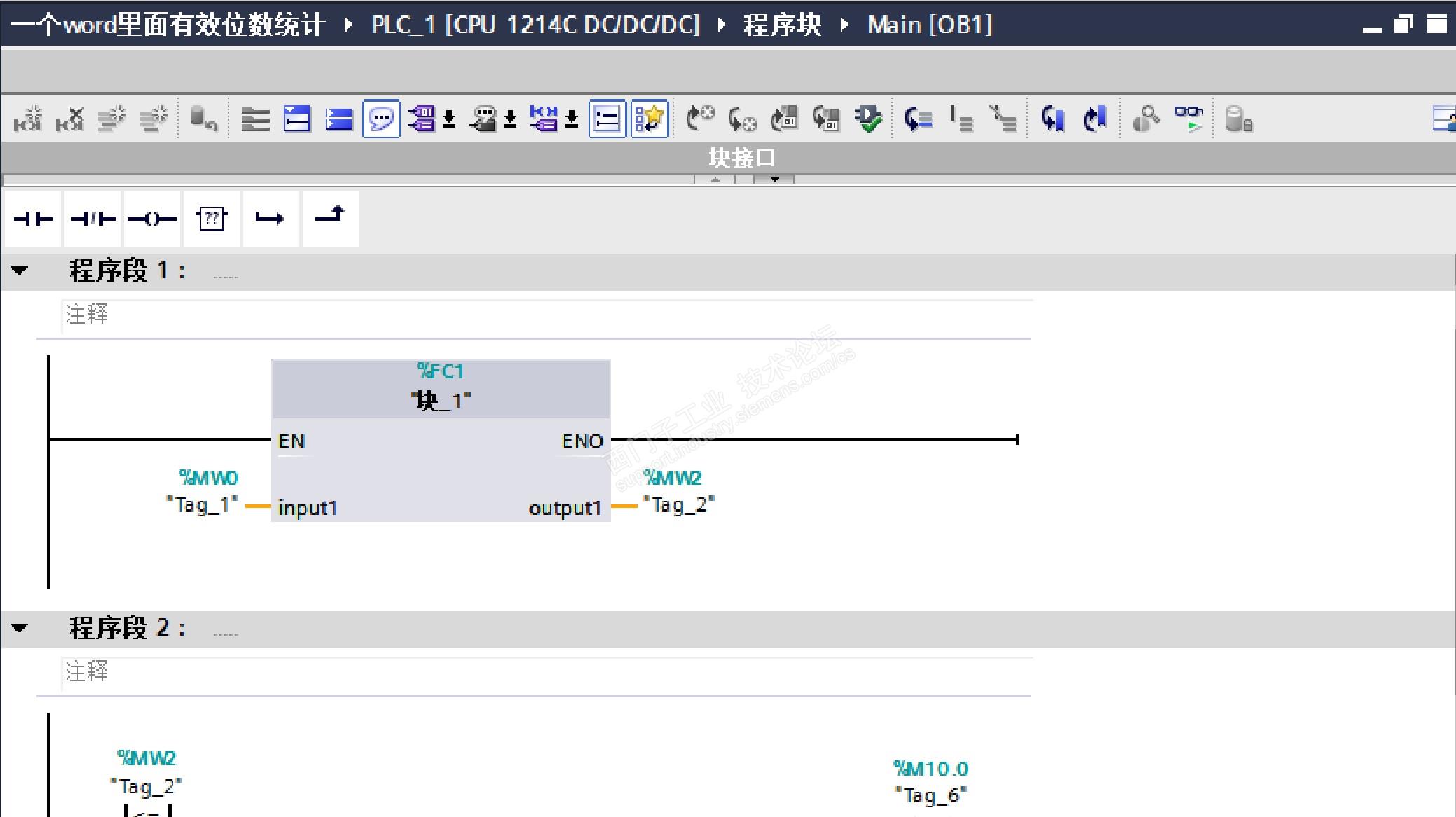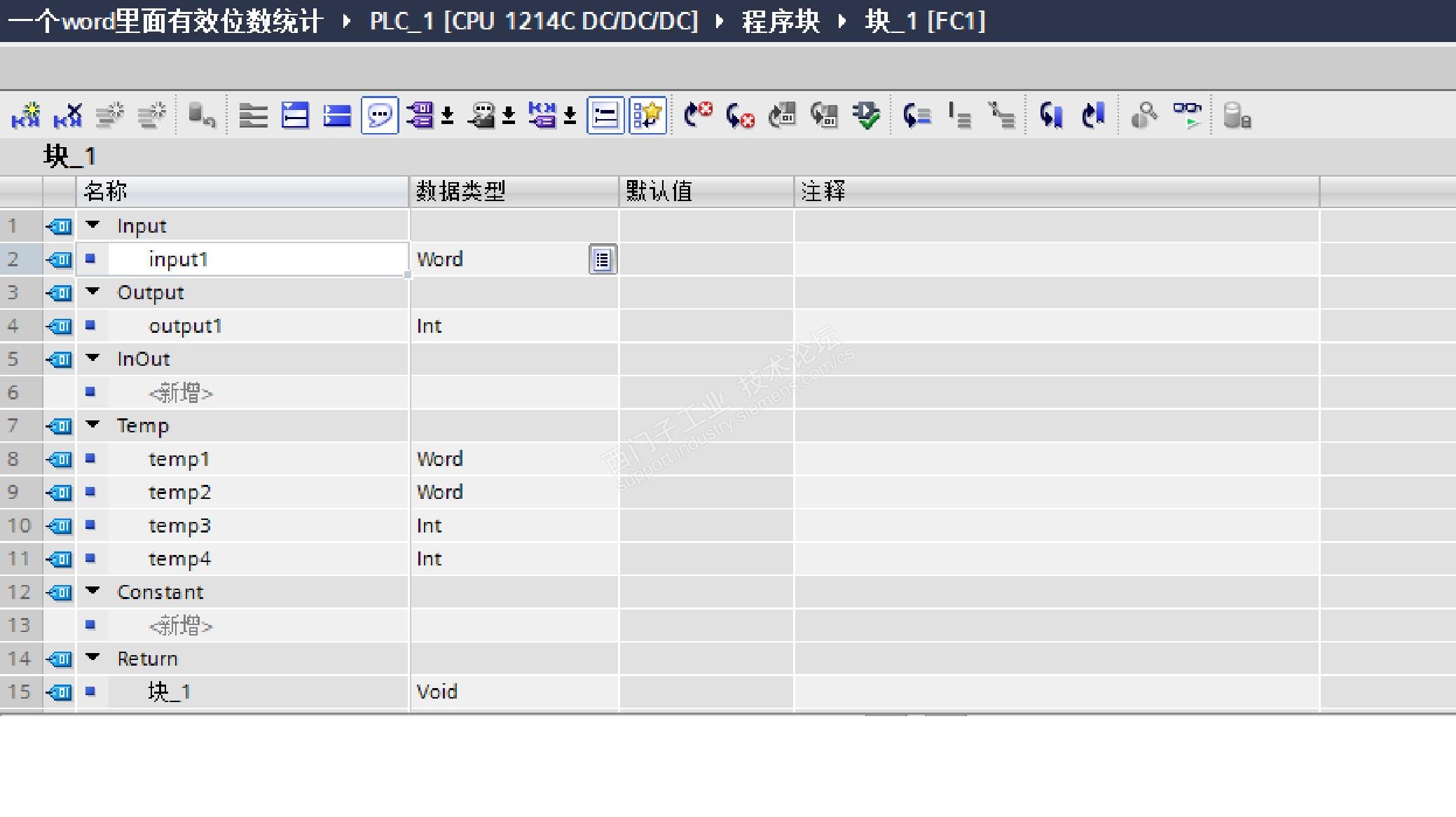 创建一个测试的项目,如S7-1214C DC/DC/DC的PLC,新建一个功能FC1,并定义接口变量,及控制程序: