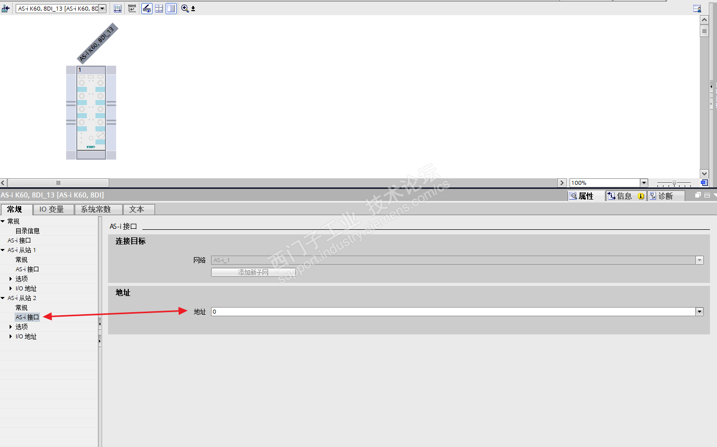 我双击这个报错,没有反应。于是到设备视图里查这个模块,结果发现其AS-i接口地址为0,如图中箭号所指;而且修改不了这个地址。这真是怪事。我想,可能就是因为这里的AS-i接口地址为0,编译时才会有报错吧。但是这个数值修改不了。
