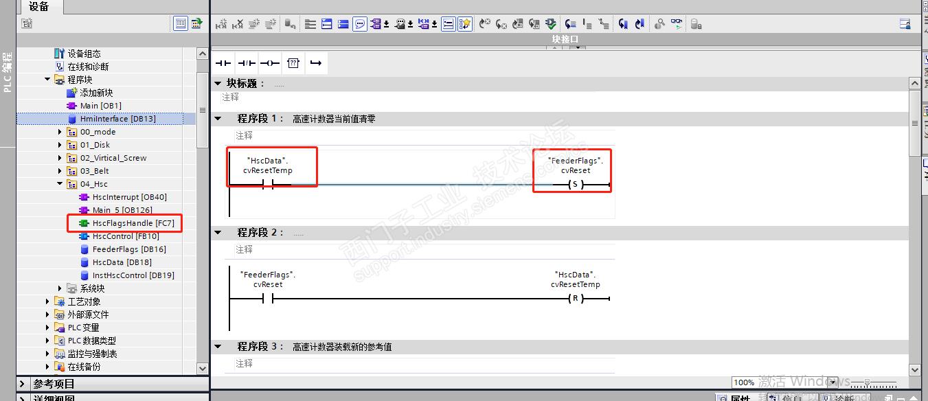 在课程中提到有时候会出现当前值无法清零的偶发情况,补救措施是将HMI中写入的数据放到一个单独的数据区,比如DB块中。然后在适合的时间点再将DB块中的数据移到相应的参数区中。是用“HscFlagHandle”功能块实现的。