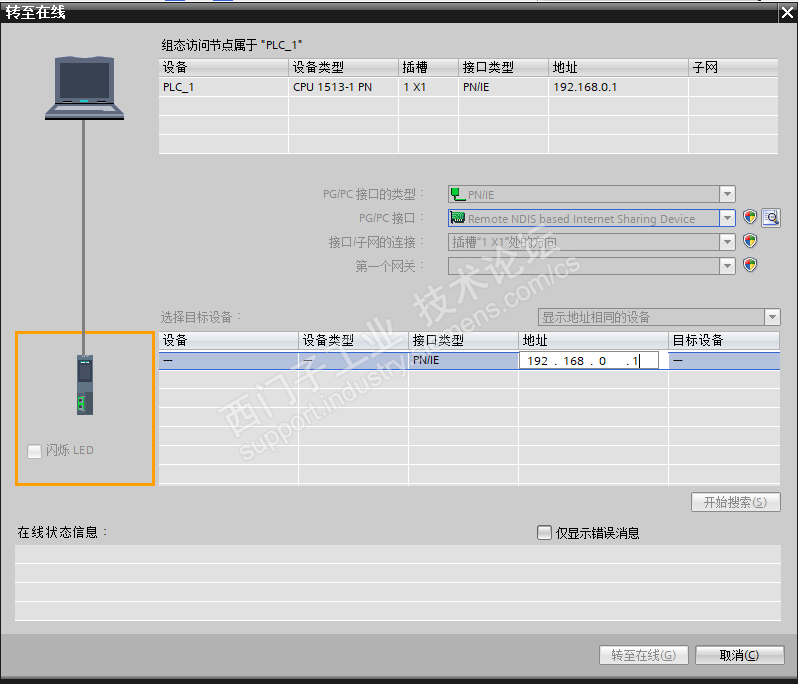 然后在【转至在线】窗口和下载程序一样选择好联网的网卡然后在选择目标设备的地址中输入能直接连接到PLC的IP地址(一般是路由器转换后的地址不是PLC项目中的地址),输入完成后会自动搜索这个地址的设备(此时通讯采用102端口),如果找到设备窗口下方的转至在线按钮会被激活,此时点击转至在线,如下图所示。