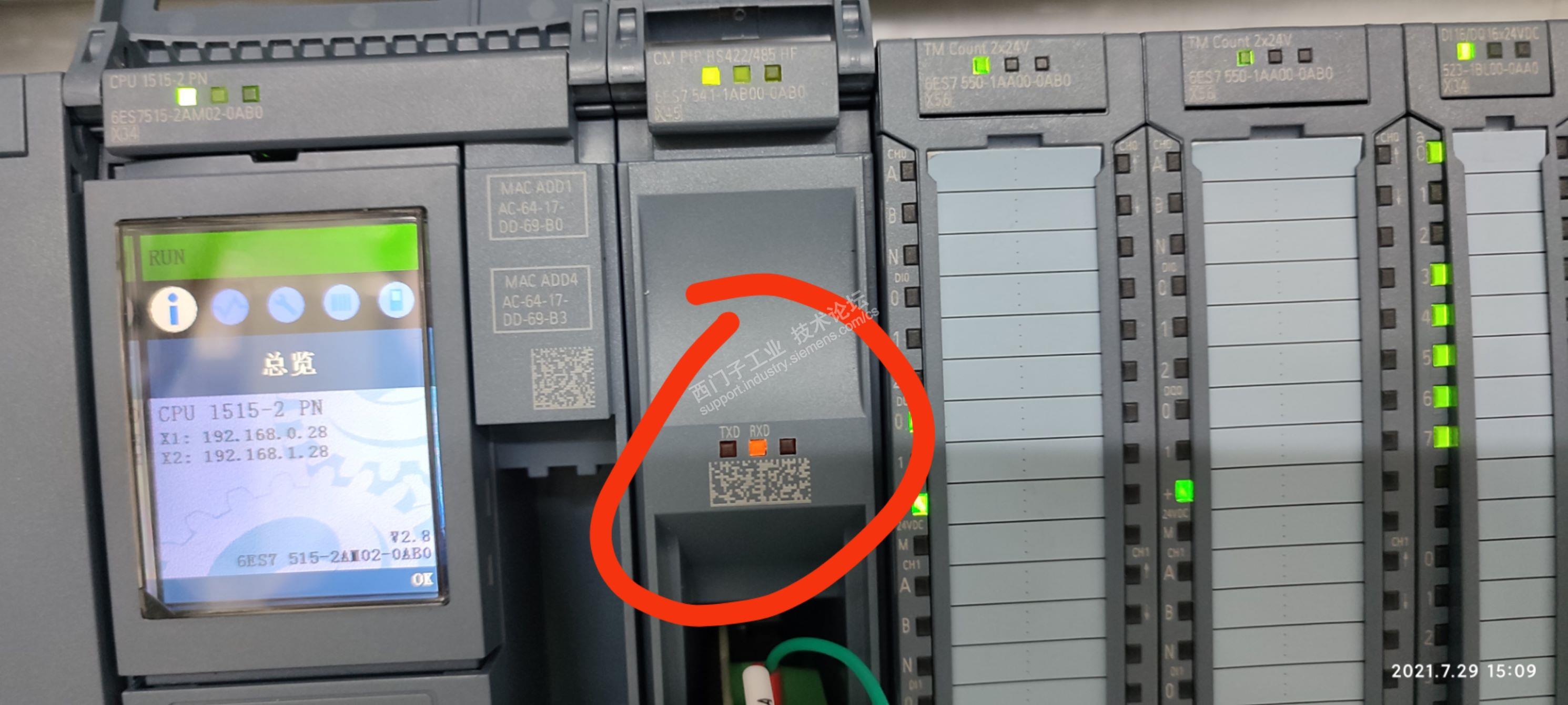 哪位大神可以帮下忙?1515-2 PN CPU 通过 CM PtP RS422/485 HF和变频器通讯,初始化modbus load指令后后,用Modbus_Master指令读取数据时,busy一直高电平,报警代码是7002。模块的TXD指示灯不亮,RXD指示灯比较暗,请问怎么解决?手的上的解释不太懂,麻烦高手指点一二。