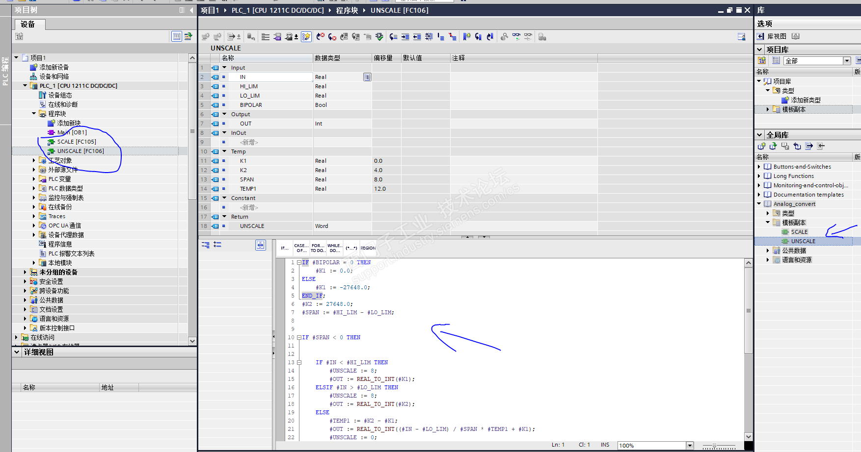用惯了300plc。最近才刚接触博途,发现1200下没有fc105和fc106。查资料后发现西门子论坛有Analog_convert这个库文件。下载后发现只能用在博途v13上。然后搜索到源程序,想直接在博途v16上复制粘贴进去,发现竟然1200没有stl语言。于是根据源程序用scl语言重新写个模拟量处理模块。保证了原汁原味。库文件及源程序以及scl源程序都在压缩包里。方便你我他。大神就勿喷了,刚接触博途还有些不太懂。