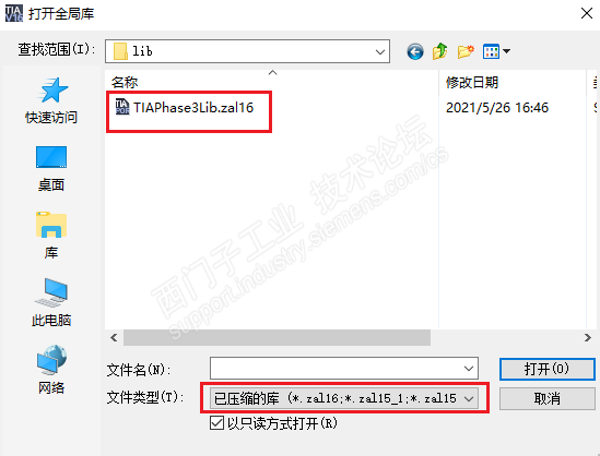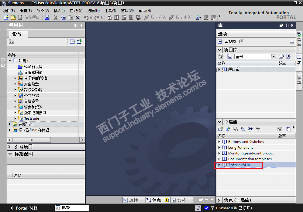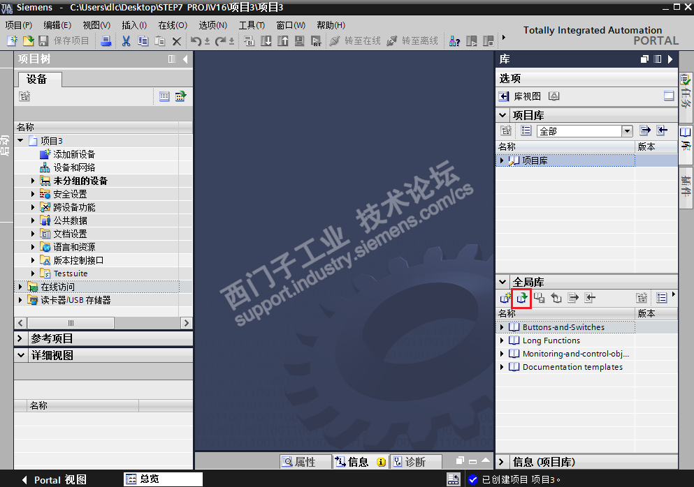 3、打开博途软件,在全局库界面里,点击打开按钮,如下图红色标注