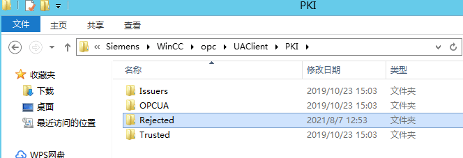 然后设备右键点击“浏览OPC服务器”,第一次弹出 客户端证书有问题,然后在wincc 7.5安装目录下的rejuected文件夹下,把被拒绝的服务器证书剪切后粘贴到了 下面 Trusted文件夹下;