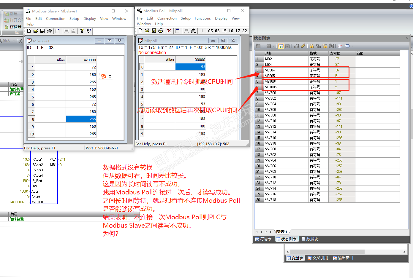 问题:必须要使用ModScan或者Modbus Poll连接一下,然后PLC才可以读写Modbus Slave,否则,读写不成功。