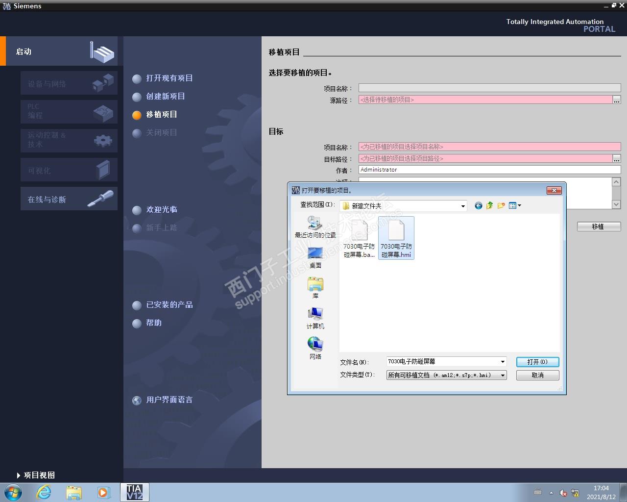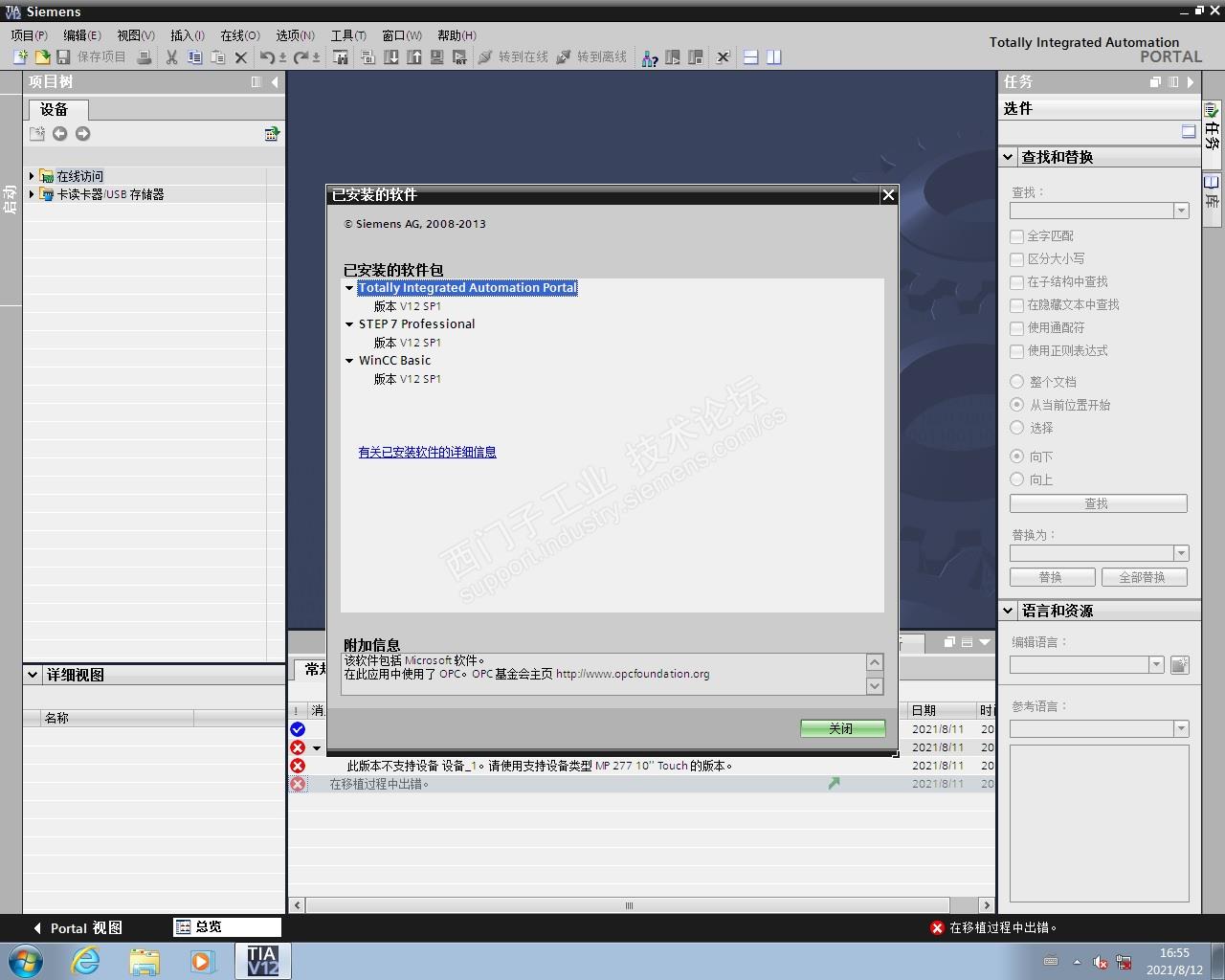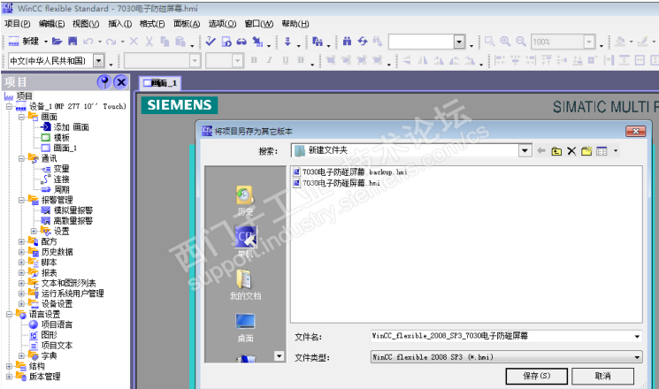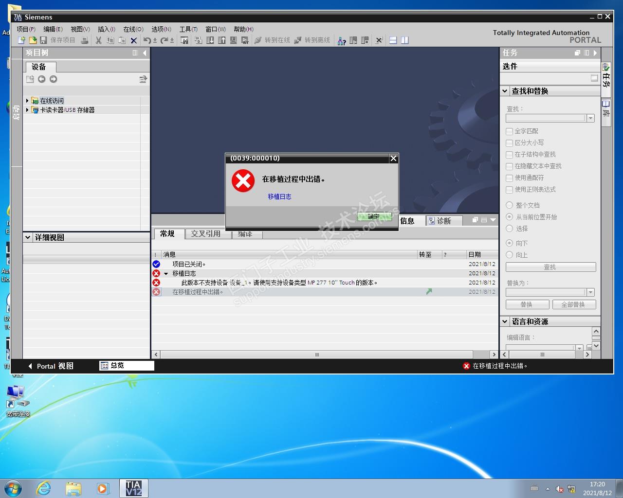 群内各位专家们,近期项目上有个使用之前MP277 10"TOUCH的触摸屏,现在需要更换触摸屏为TP1200 comfort,按照网上说明安装WINCC FLEXBILE2018 SP4将项目另存为版本为SP3,然后打开博途V12 SP1进行项目移植,但是进度到9%左右,出现移植过程错误消息:此版本不支持设备,请使用支持设备类型MP277 10"TOUCH的版本