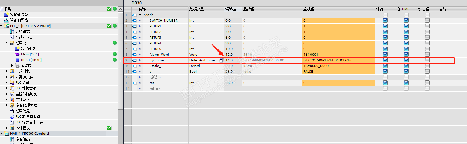 300PLC 触摸屏 tp700 ,在连接- 区域指针-时间日期-里面选择的是PLC连接,变量是PLC的系统时间,使用SFC1读取出来的,在触摸屏上显示没有问题,就是报警视图里面却是,显示的是触摸屏的系统时间,我希望报警视图里面显示的是PLC的时间。这个设置是哪里有错误吗? 参考资料,精智屏密码,时钟设置https://www.ad.siemens.com.cn/productportal/prods/hmi/comfortpanel/q3_password&clock/list_q3.html这个资料我看过,但是 但是 但是 我想问的是为啥报警视图里面的时间是触摸屏时间不是那个同步的时间呢?