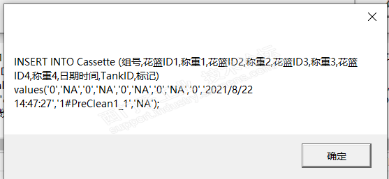 结合1 会返回查询正确。 3 ,插入语句 strSQL = "INSERT INTO Cassette (组号,花篮ID1,称重1,花篮ID2,称重2,花篮ID3,称重3,花篮ID4,称重4,日期时间,TankID,标记)values('"&ZH&"','"&Cassette1&"','"&Weigh1&"','"&Cassette2&"','"&Weigh2&"','"&Cassette3&"','"&Weigh3&"','"&Cassette4&"','"&Weigh4&"','"&Time1&"',"&TankID&","&Lable&");"