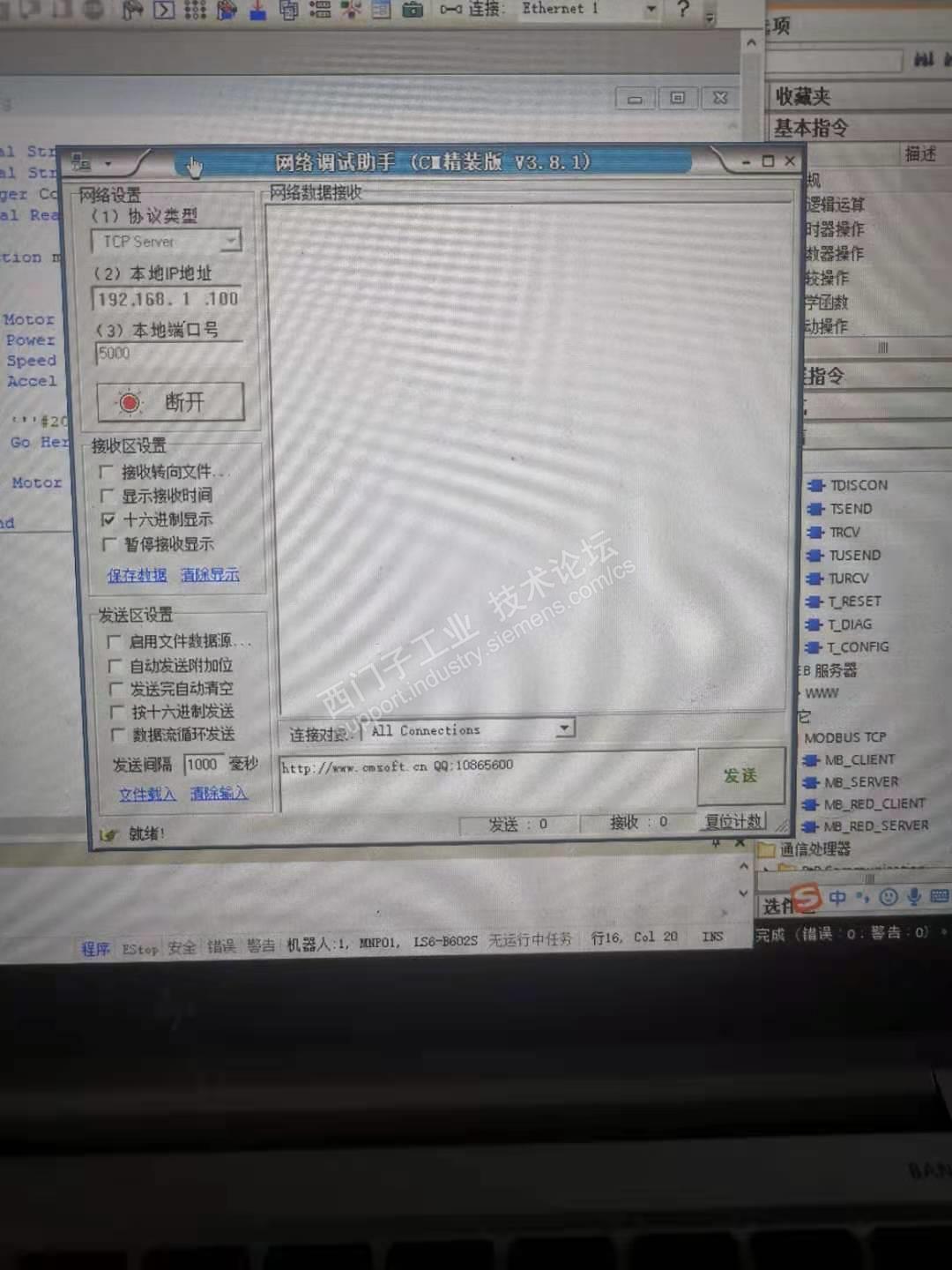 我现在在用1215和爱普生机器人通讯,爱普生这边已经设置好了,用网络助手也都可以运行,但是不知道在西门子这边怎么做,我TSEND_C和MB_CLIENT都试过,但是效果都不好,然后我刚才用TSEND_C和网络助手通讯,也是一直都不行,收不到信息,用Done和Error捕捉,两个也都没有激活过,STATUS那里一直是7002,我也不知道是怎么回事,哪位可以指点一下么?