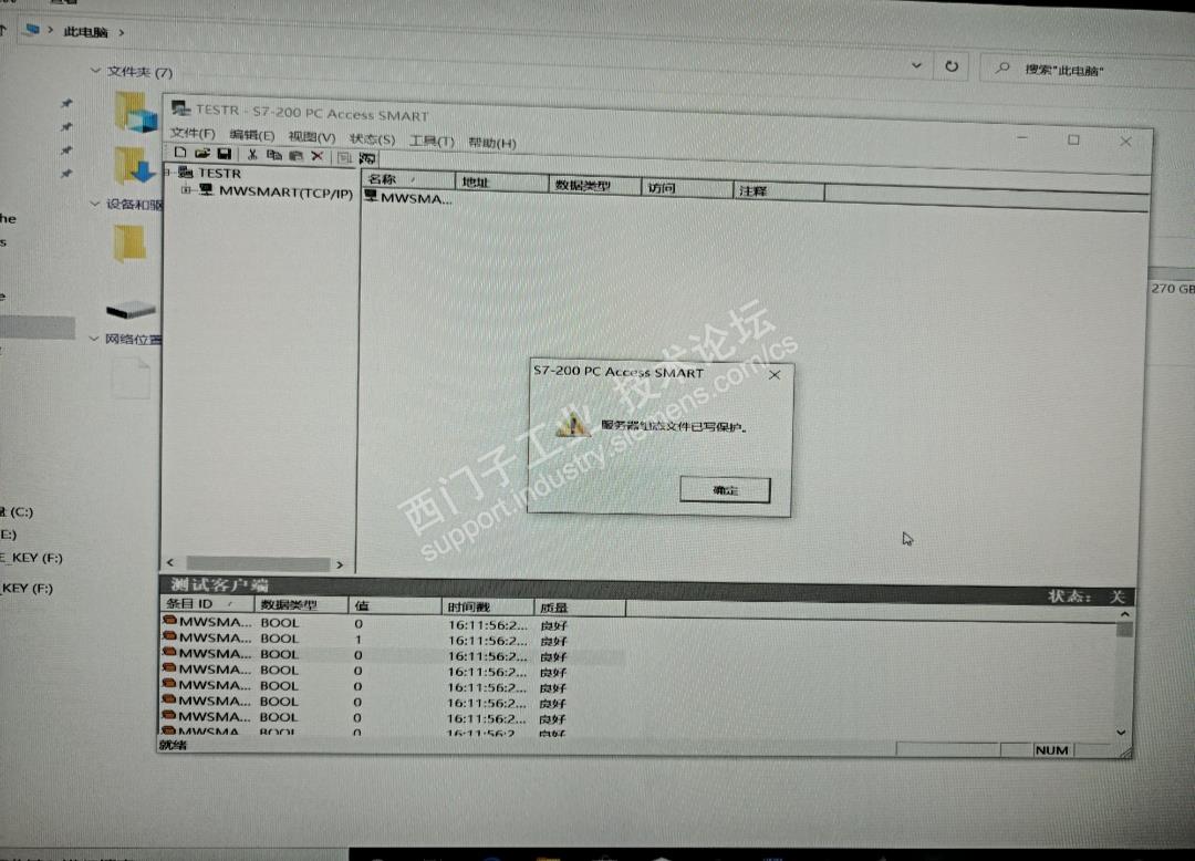 有一个现象就是打开pc Access v 2.3时候双击,然后选择建的.sa文件再保存时候提示服务器写保护,如果右键点击软件选择以管理员方式打开,之后就可以保存。给我的感觉就是wincc加载得不是我建的这个test.sa文件。