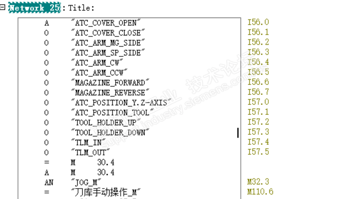 刀库换刀有个手动操作面板,上面有个按键ATC_POSITION_Y.Z-AXIS,对应PLC输入端口地址是I57.0,在PLC里只有这一个地方用到I57.0,在其他地方没有使用。这里的M30.4只是来判别刀库是否有其他手动按钮被按下。但是现场按下I57.0这个按钮,主轴就会分别沿Y Z向进行移动到换刀点。那是不是在换刀程序里读取了I57.0状态,如何读取呢?如果在PLC里来控制轴移动,怎么找不到呢?