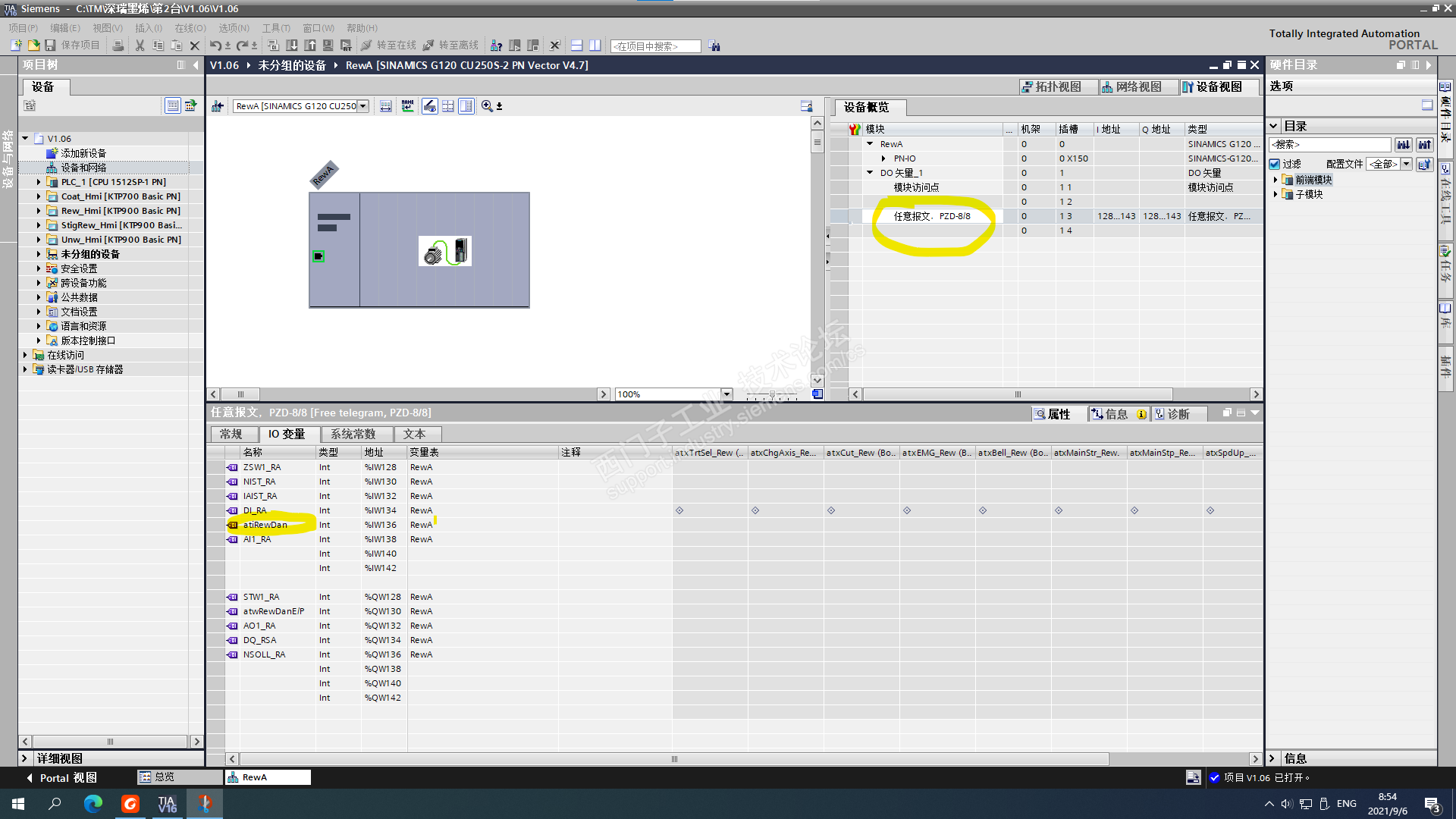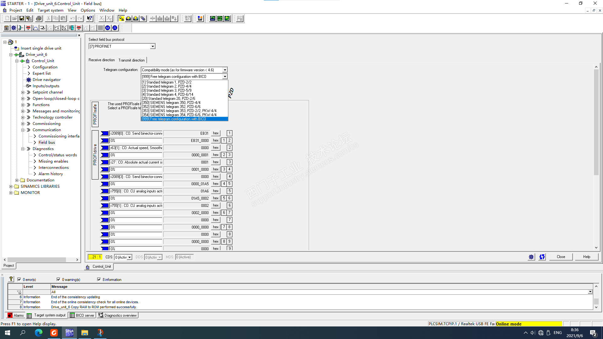 刚好现在出差到现场。有截图了。前2个是用STARTER调试G120。S120大同小异。首先,在通讯里设置999报文。把第5个字组态到755。再到输入输出里,把模拟量输入1组态到第5个字。这样,120端子上的模拟量就组态到报文的第5个字。到PLC里设置G120的报文是自由报文,把第5个字定义下,比如图中定义为Dan,再把这个Dan关联到PID的输入。至于STARTER如何操作,Y版有个经典置顶帖,你可以看看。