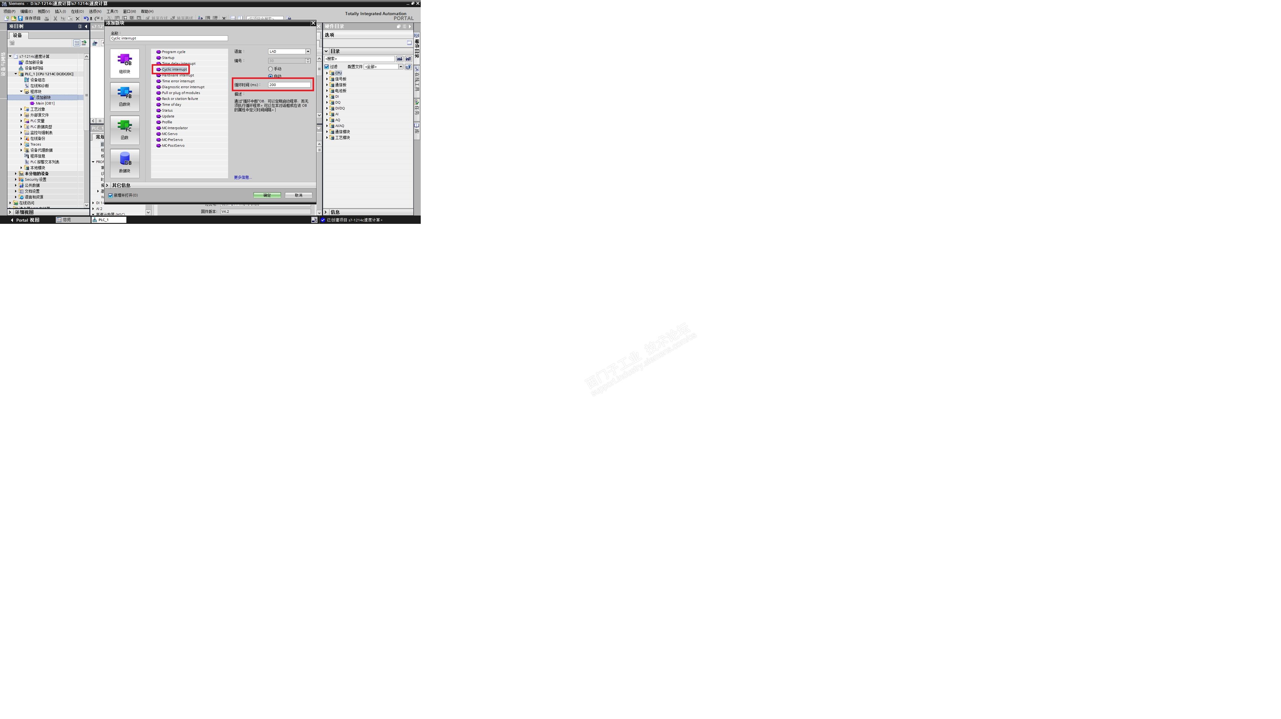 2) 插入一个循环定时中断,设置定时中断时间周期为200mS,图示: