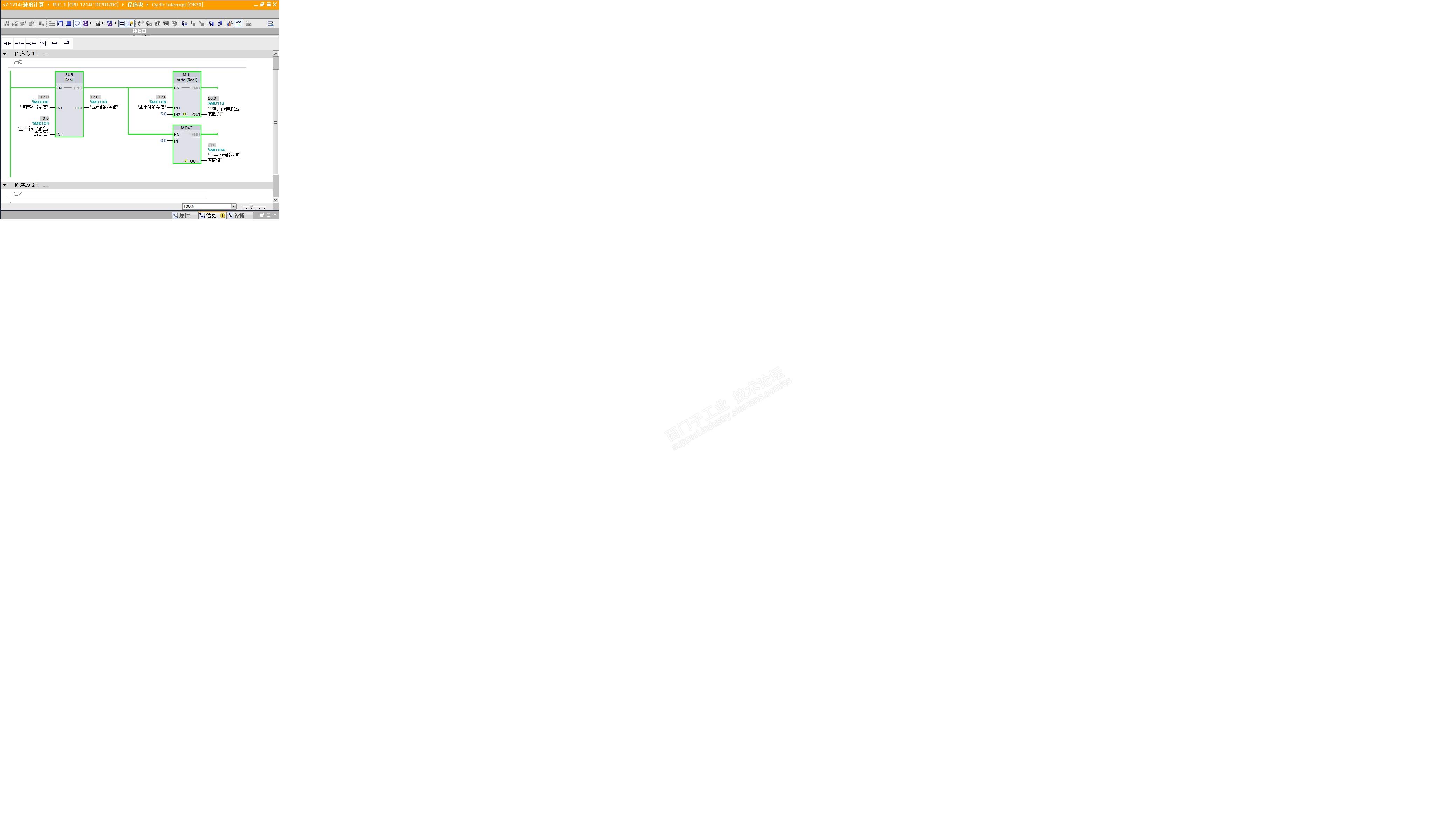 3) 速度程序,在设置的定时中断组织块OB30中编辑速度程序,图示: