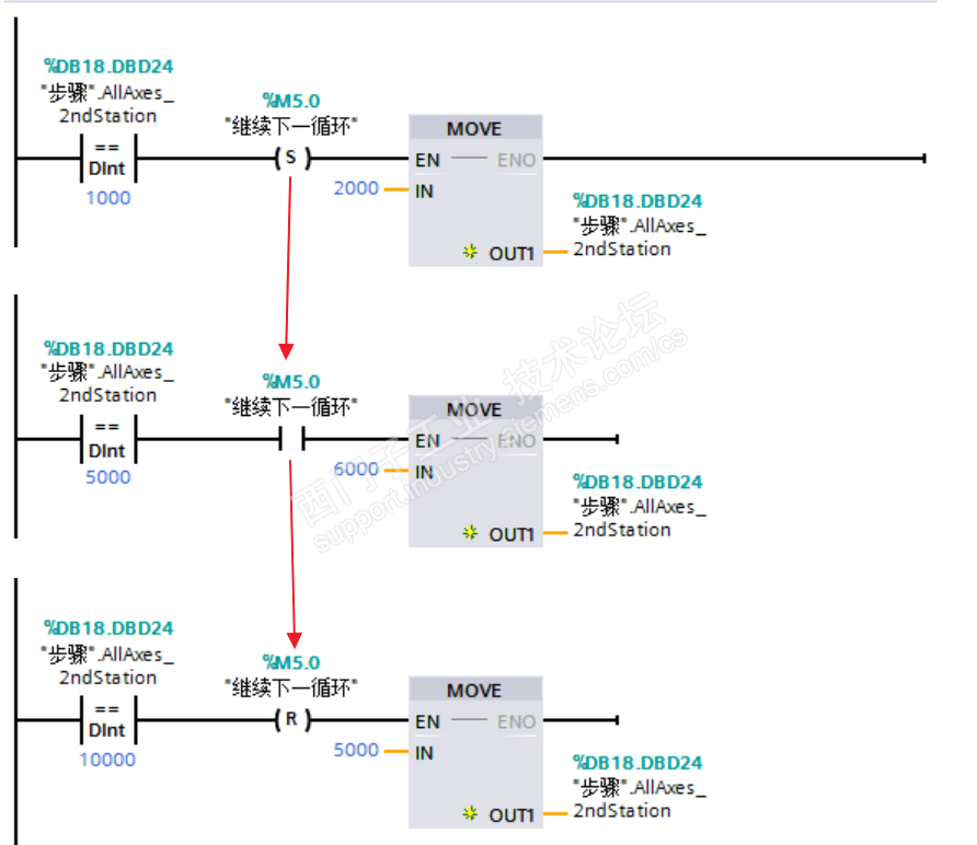 如下图是一个简化T形图。程序第一步将M5.0置位,这样它可以一直走到程序最后一段;随后跳到=5000处,这时在面板上按一下M5.0,程序继续运行,直到最后一段。此后程序就在=5000处和=10000处循环;每一个循环,都得由面板上的M5.0确认。这是我的设计思路。可是实际上,在面板上按M5.0时没有任何反应。不管把M5.0设置为反转型还是置位型还是其它什么类型,按它时都没有反应。这是是什么原因?