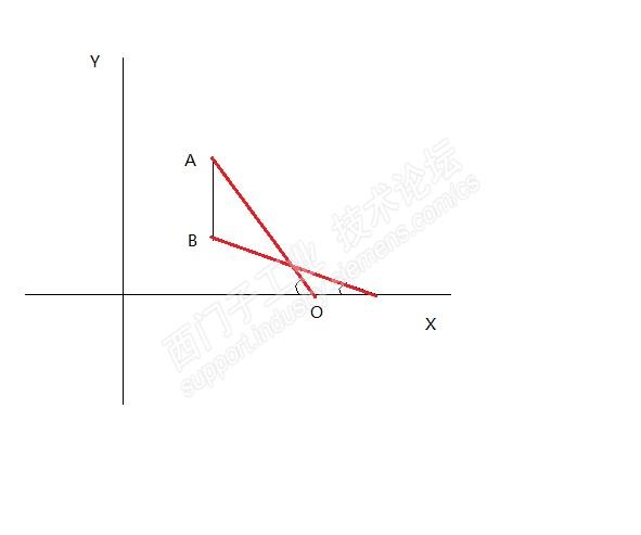 有一个直线形状工件,如上图红色的直线,只能绕O点做圆周运动或沿X轴做水平运动,现在是要控制工件头部从A点走直线到B点,也就是工件一边逆时针旋转,一边向右平移。现场有s7-1500,两套变频器+电机,编码器(编码器没法接在变频器上,直接进了PLC),硬件已经安装固定没法改变,变频器做的是速度控制,现在的方案是:
