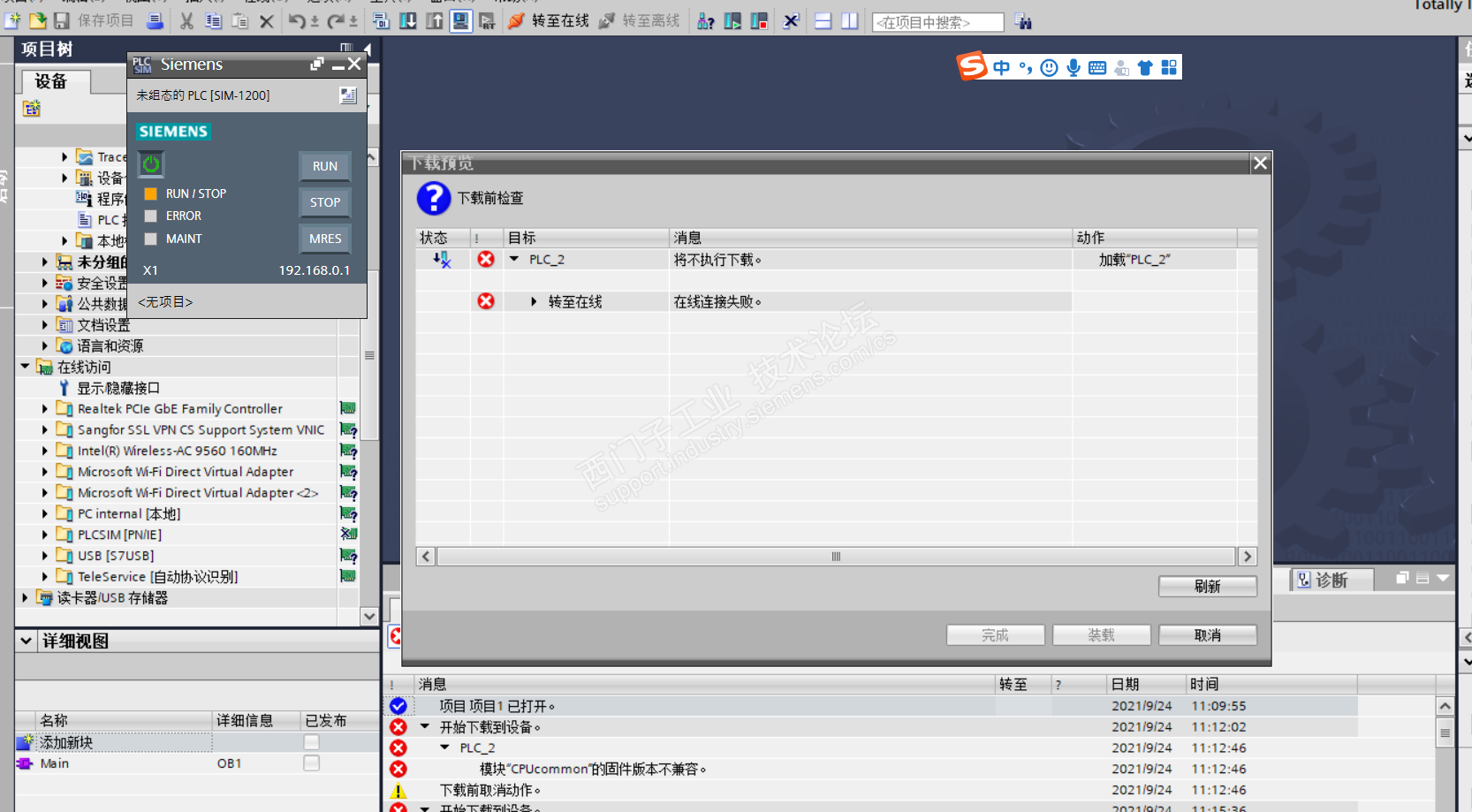 TIA Portal V15.1 S71200仿真提示固件不兼容下载不了,之前是提示1200需要固件版本高于4.0,直接启动仿真不了,后来升级4.3HSP后就成这样了,求各位大师指点