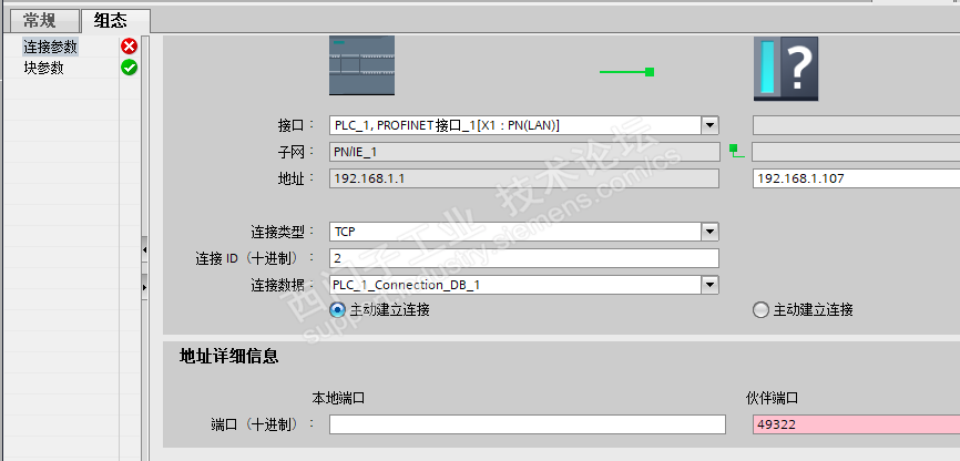 在指令的CONNECT引脚关联的DB块,修改参数remoteport为49322,然后编译是可以通过的,