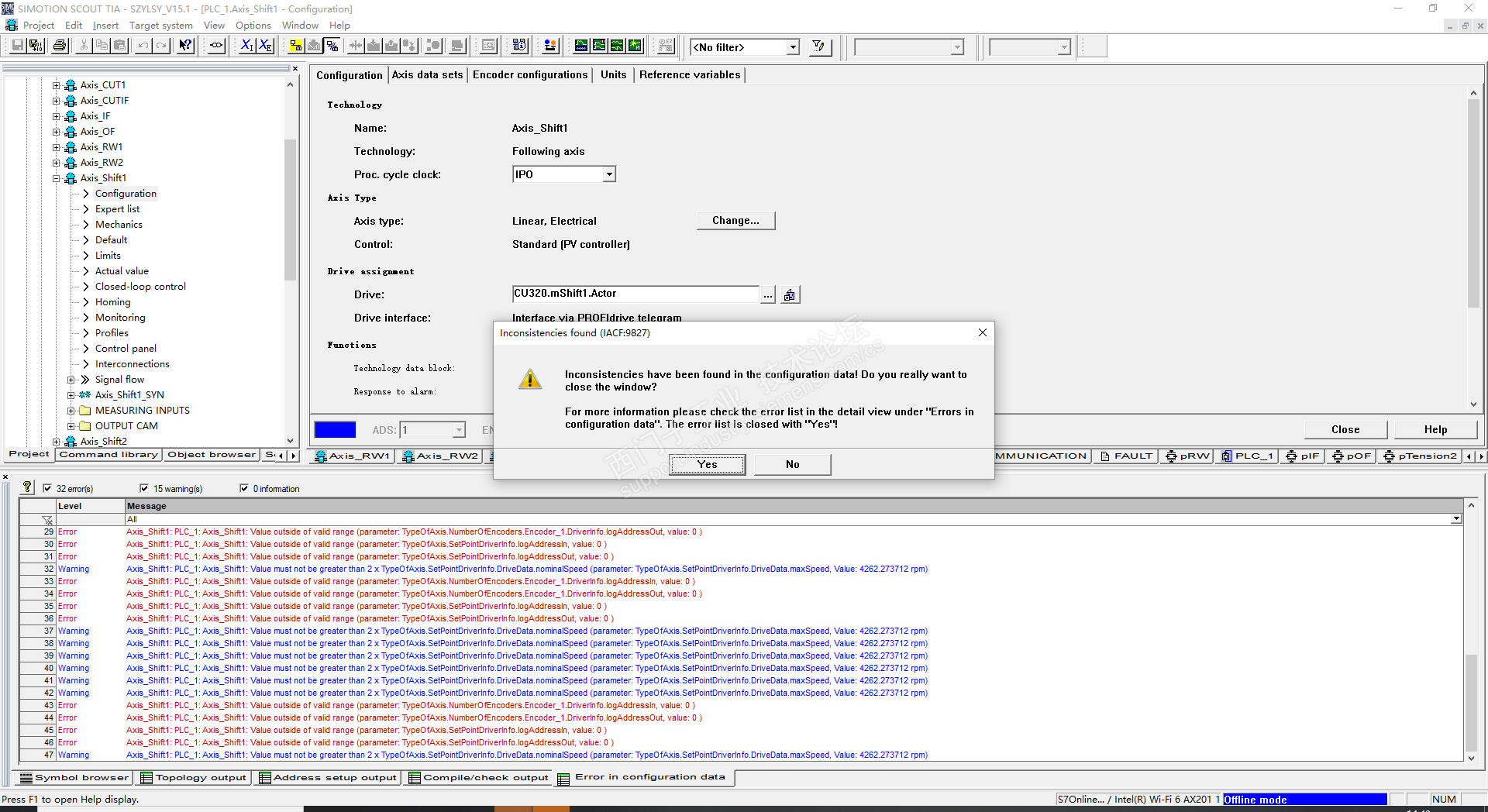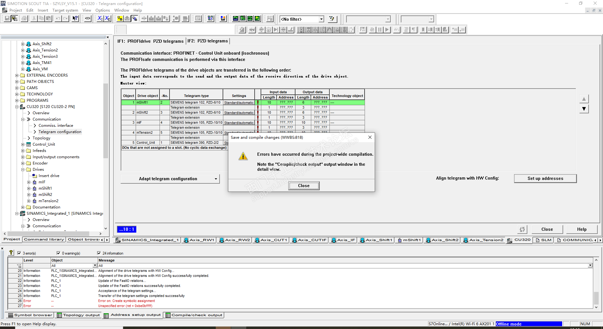 如题, scout TIA 中外挂CU上的轴激活工艺数据块后报错, 而用simotion scout激活后编译就没问题, 有大神知道怎么回事吗? 谢谢