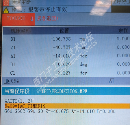 1,程序在执行R409=$AC_Timer 时报警的对吧?是把9号计时器的时间赋给R409对吧。