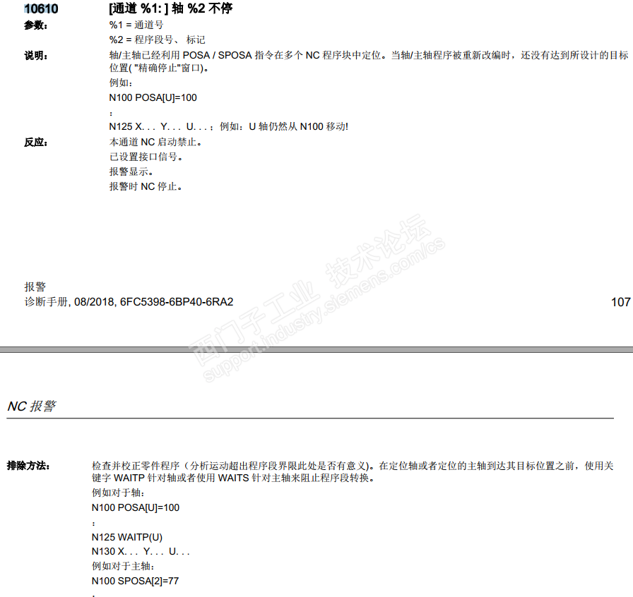 图片分别是.mpf程序段,及停机时设备画面,及10610官方解释。