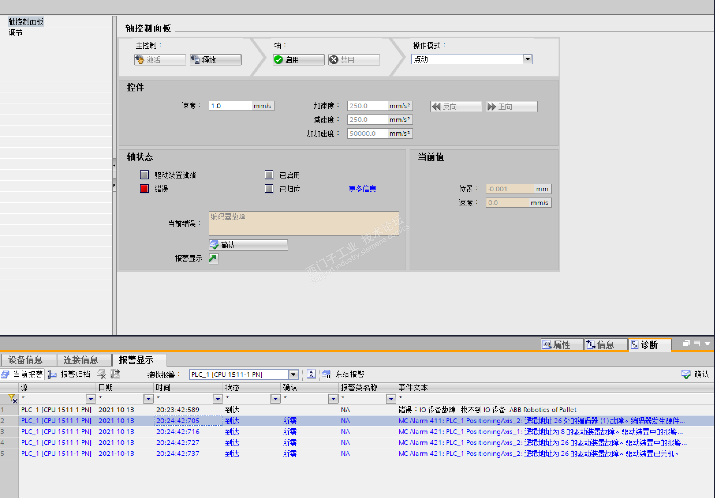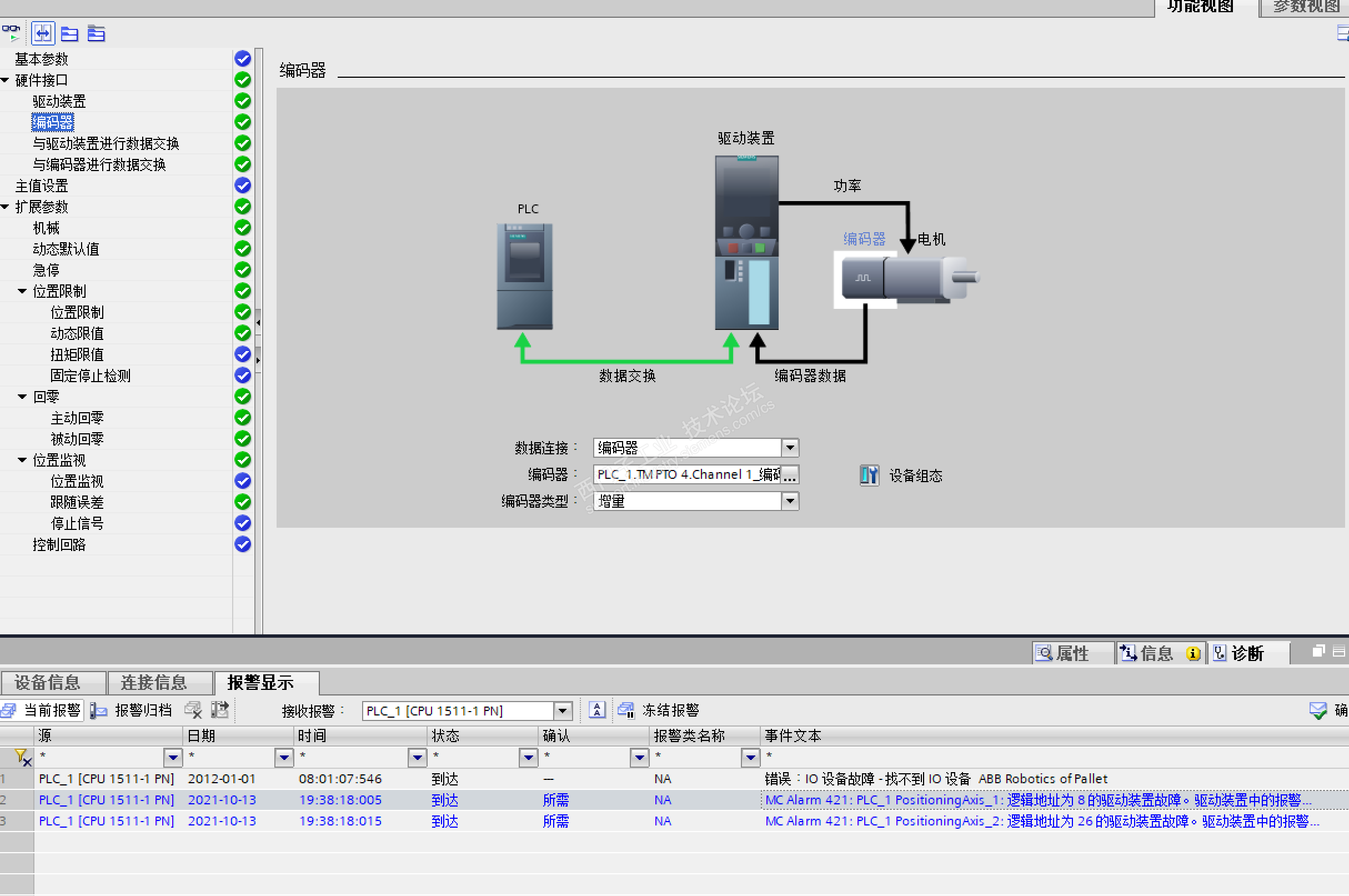 正向点动没有问题,反向点动就报警,报警内容是另一个轴的编码器故障,驱动装置故障。线性轴也报警驱动装置故障,且故障在诊断中确认后又弹出,无法复位。驱动器并没有任何故障报警。