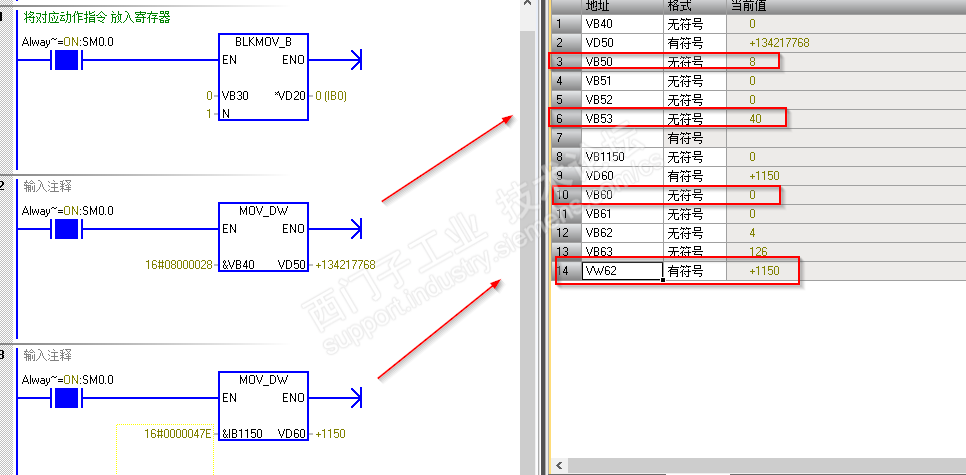 完整一个指针四个字节分成高低字两部分。高字指向某区域。例如:16#800 是指向V区。0 是指向I区。还有Q区M区S区SM区T区C区是其他值。而低字是指该区的地址。