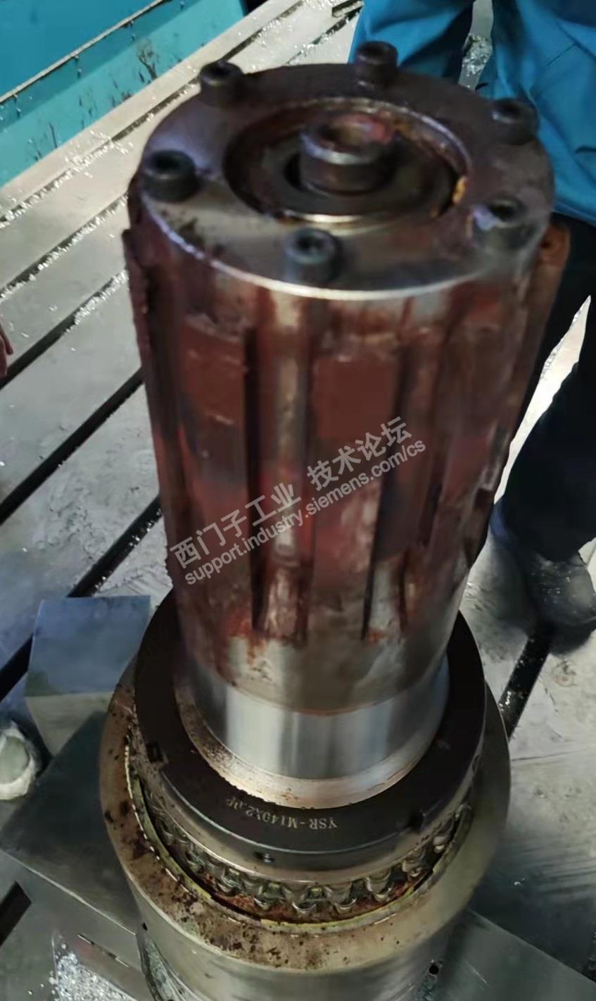 将主轴拆除后发现主轴轴承已严重缺油,打刀垫片脱出,找到故障原因,拆除上部油缸时碟簧处于压缩状态,将上部油缸拆除将垫片弹飞。再次安装时垫片未就位,导致故障依旧。如图