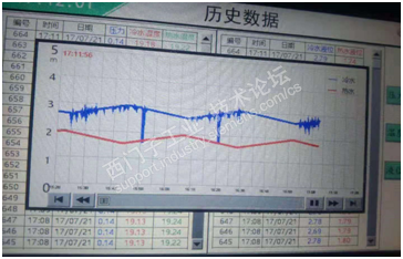 蓝色和红色均为液位,其中一个显示稳定,一个显示波动较大,第一反应是干扰问题,但是,一般干扰是持续的,一直有干扰或一直没有干扰,但是上图中蓝色曲线,有2段是稳定的,稳定的这段时间也没有其他设备的启动和停止,而且现场走线比较严格,该屏蔽的屏蔽,该穿管的穿管,无奈给厂家打电话,传感器为超声波的,厂家了解了下安装情况,指导调了个参数,近阀值,调了以后情况有很大改善。