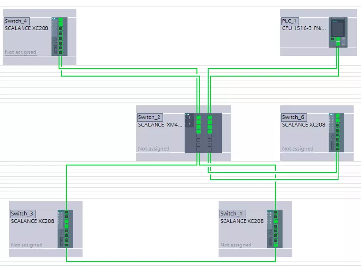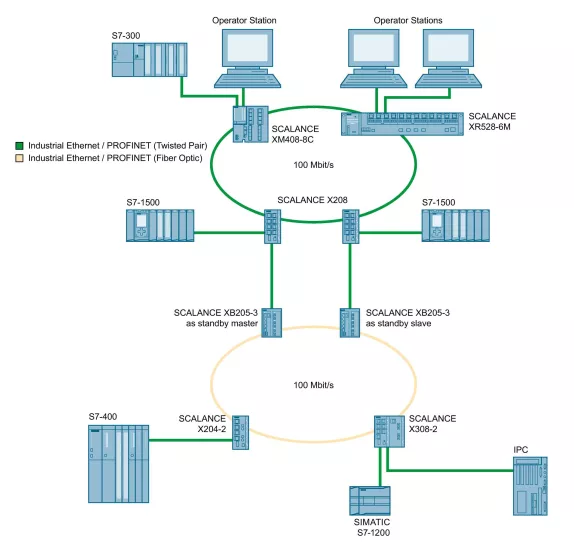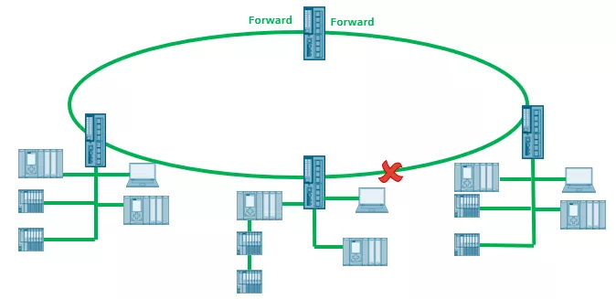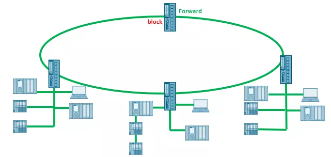 随着九十年代工业现场总线技术的快速兴起,通过通信连接大大的简化了机器设备的接线工作。早期阶段的工业设备通常组成线性拓扑,所有的状态、控制和诊断数据沿着一根电缆进行传送,网络的设计和连接相对比较简单。而随着技术不断发展,如今 PLC 控制器已经全面支持工业以太网,并且越来越多的工业网络设备的加入进来,网络变得愈发复杂。在工业现场,如果采用线性拓扑网络的某个节点发生了问题,随后的设备就会完全的断开,造成通信的中断。而针对工业技术对控制网络可靠性的高要求, 工业以太网的环网技术应运而生。
